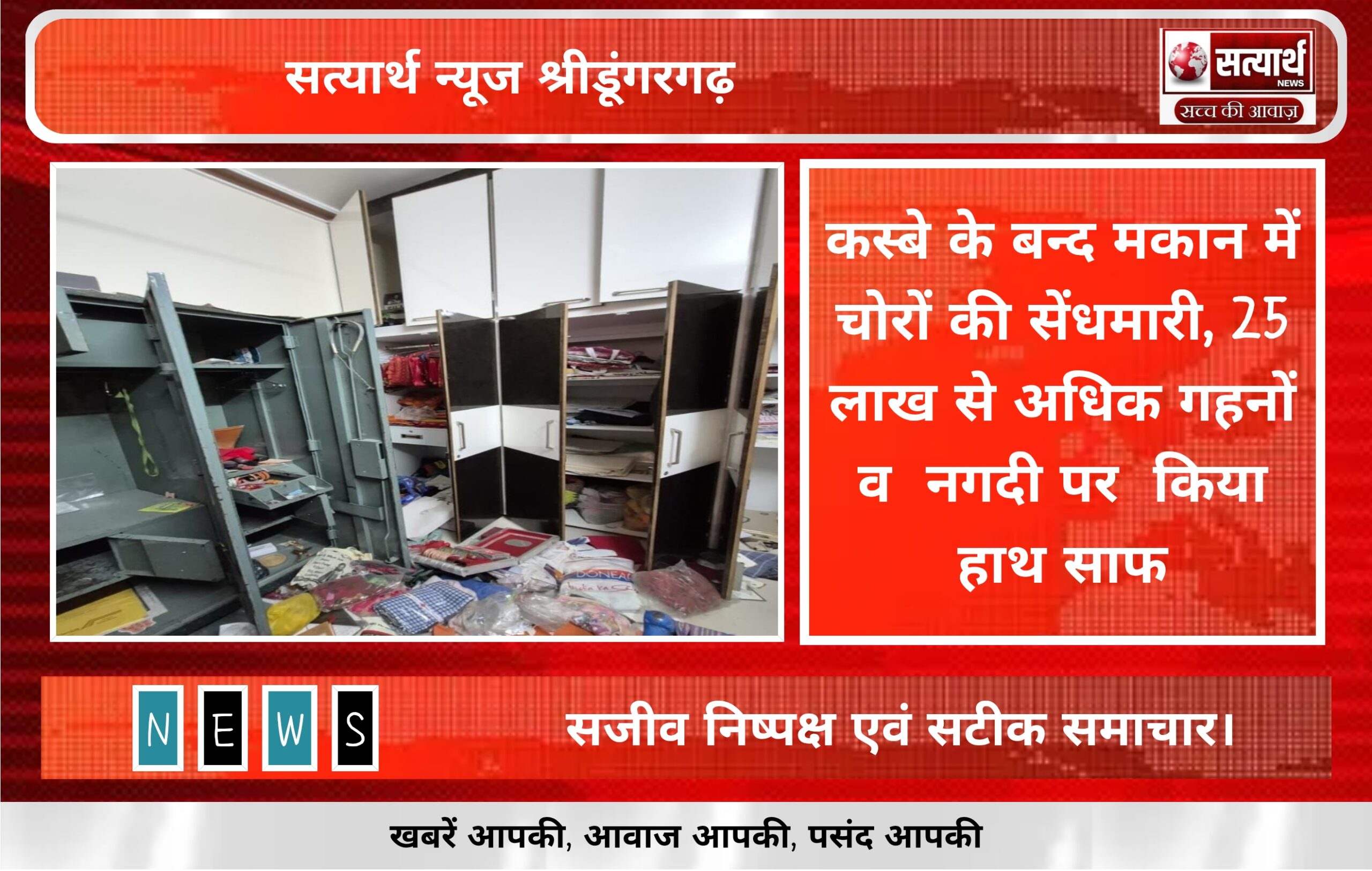 सत्यार्थ न्यूज श्रीडूंगरगढ़-सवांददाता ब्यूरो चीफ श्रीडूंगरगढ़ में एक घर को चोरों ने अपना निशाना बनाते हुए 25 लाख रुपयों पर…