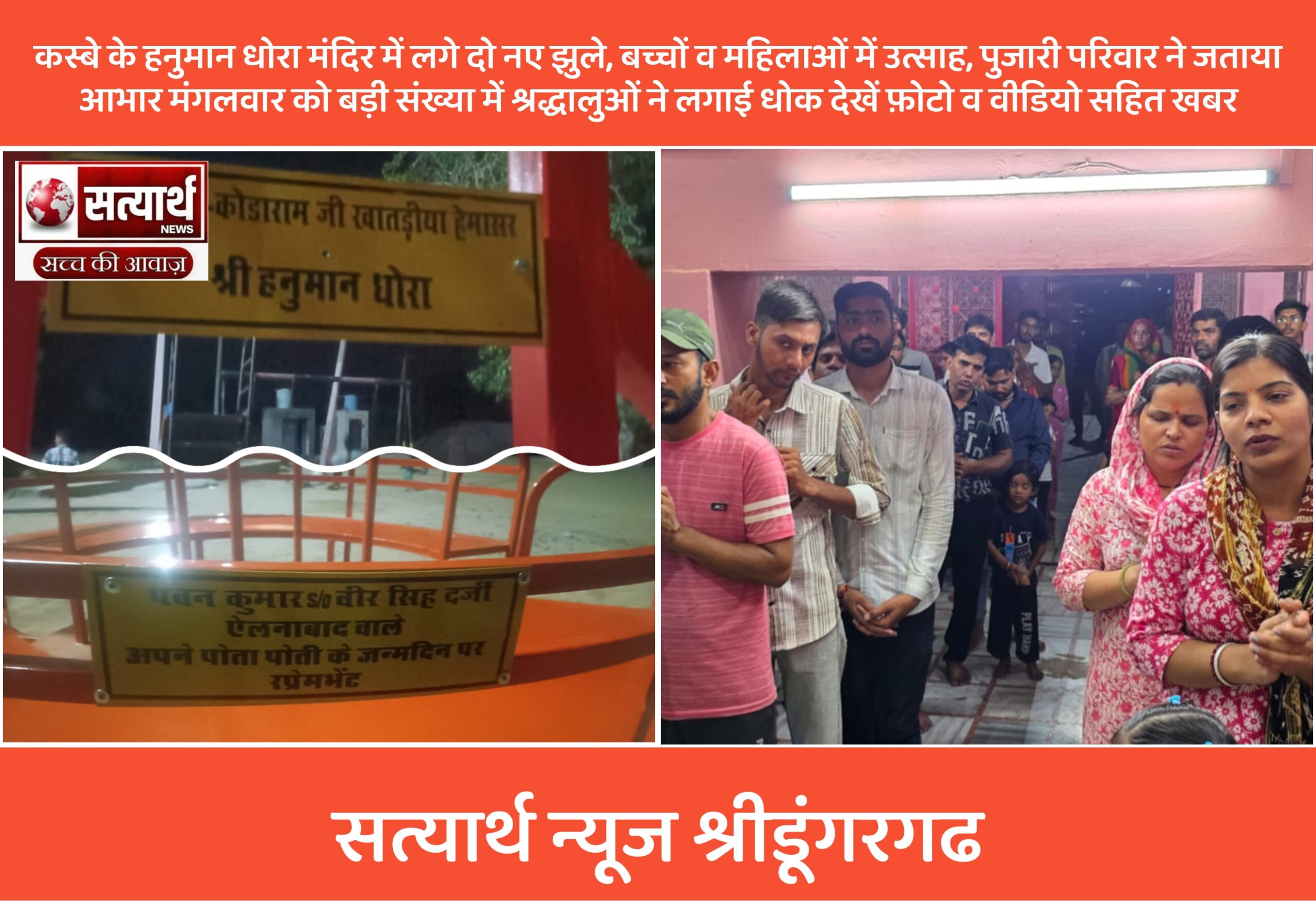 सत्यार्थ न्यूज श्रीडूंगरगढ़-सवांददाता ब्यूरो चीफ नेशनल हाईवे पर स्तिथ हनुमान धोरा मन्दिर प्रांगण में भामाशाह द्वारा आज दो नए झूले…