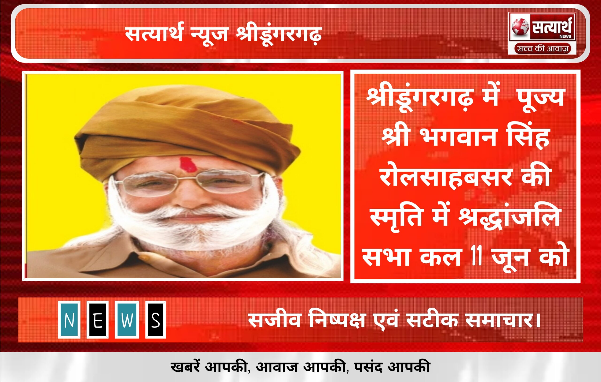 सत्यार्थ न्यूज श्रीडूंगरगढ़-सवांददाता ब्यूरो चीफ क्षत्रिय युवक संघ के संरक्षक एवं मार्गदर्शक पूज्य भगवान सिंह जी रोलसाहबसर की पुण्य स्मृति…