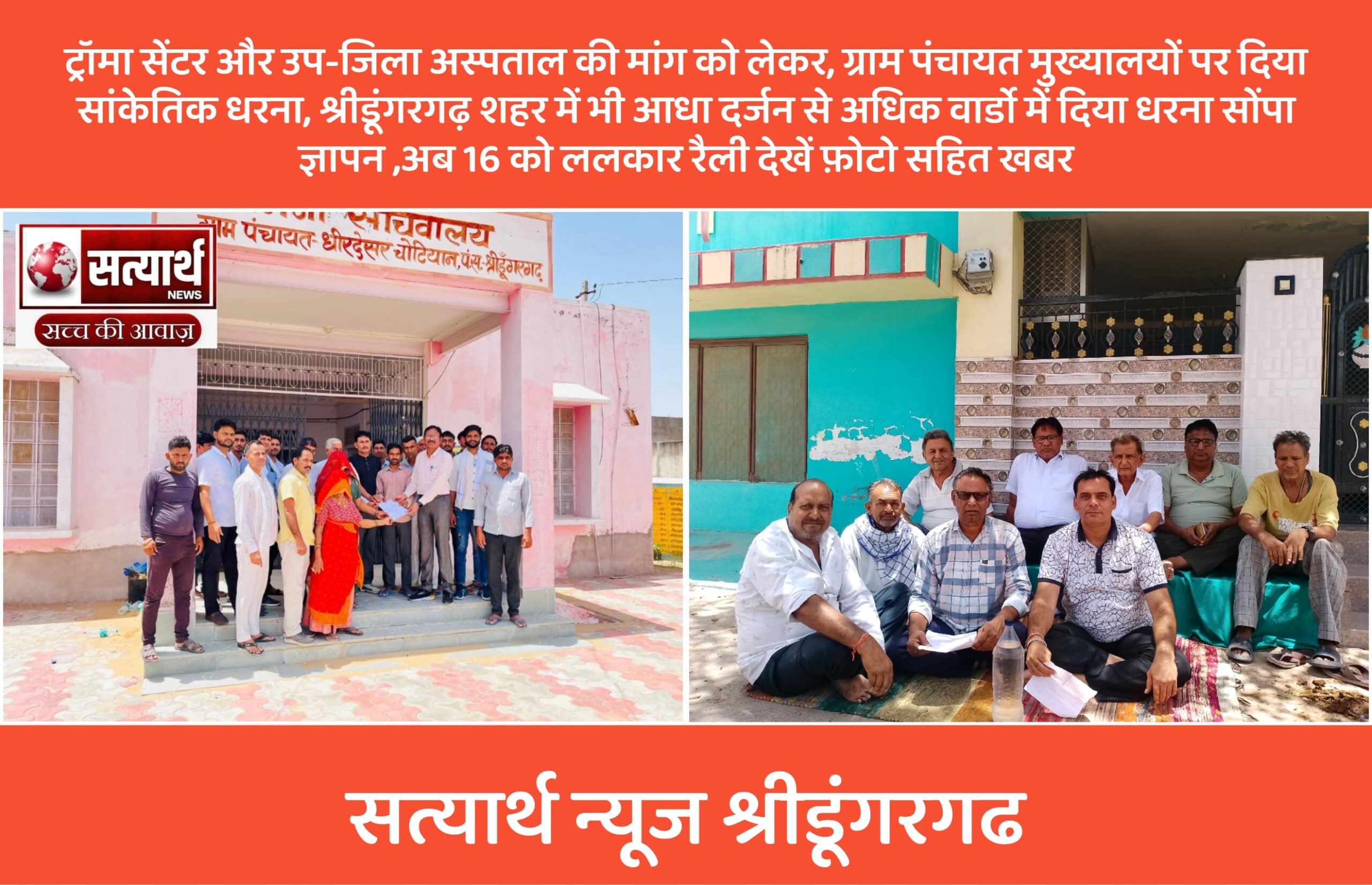 ट्रॉमा सेंटर और उप-जिला अस्पताल की मांग को लेकर, ग्राम पंचायत मुख्यालयों पर दिया सांकेतिक धरना, श्रीडूंगरगढ़ शहर में भी आधा दर्जन से अधिक वार्डो में दिया धरना सोंपा ज्ञापन ,अब 16 को ललकार रैली देखें फ़ोटो सहित खबर