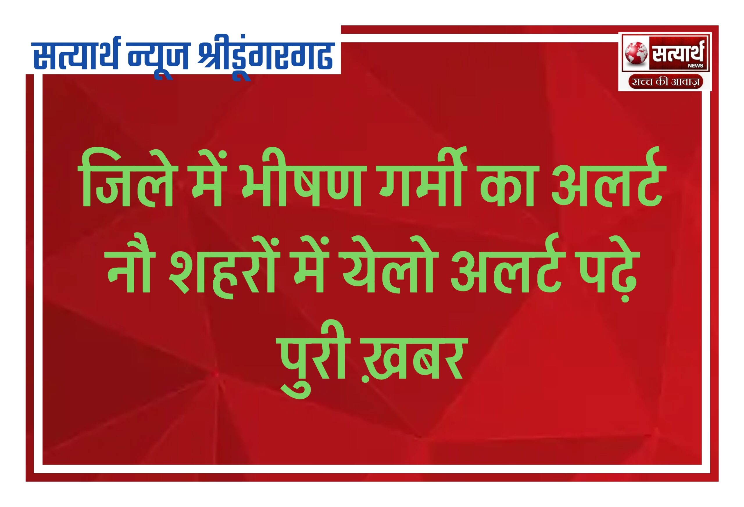 सत्यार्थ न्यूज श्रीडूंगरगढ़-सवांददाता ब्यूरो चीफ आज राजस्थान में भीषण गर्मी का अलर्ट है। मौसम केंद्र जयपुर ने सोमवार को बीकानेर,…