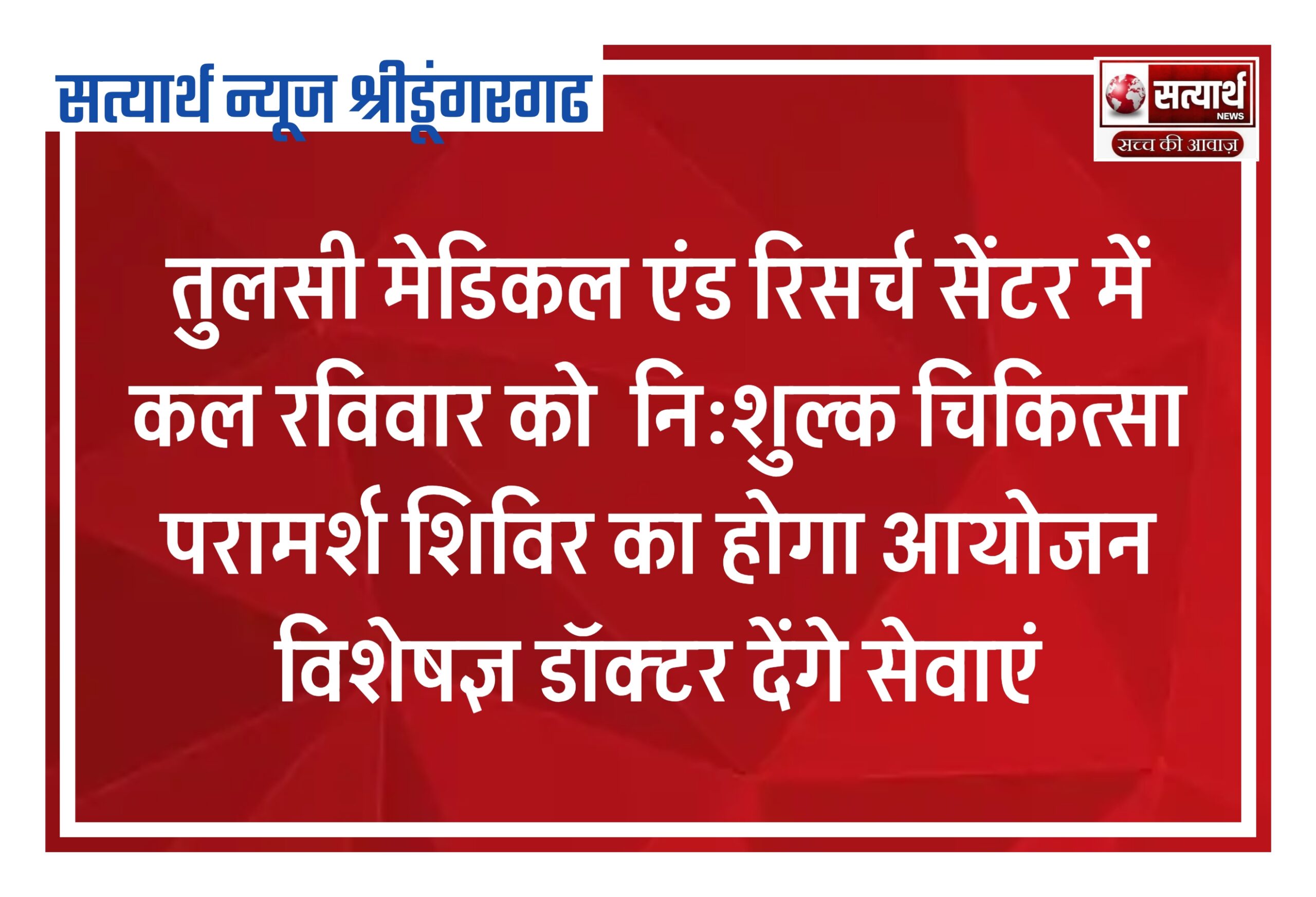 सत्यार्थ न्यूज श्रीडूंगरगढ़-सवांददाता ब्यूरो चीफ तुलसी सेवा मेडिकल एंड रिसर्च सेंटर में कल रविवार को सुबह 9 बजे से दोपहर…