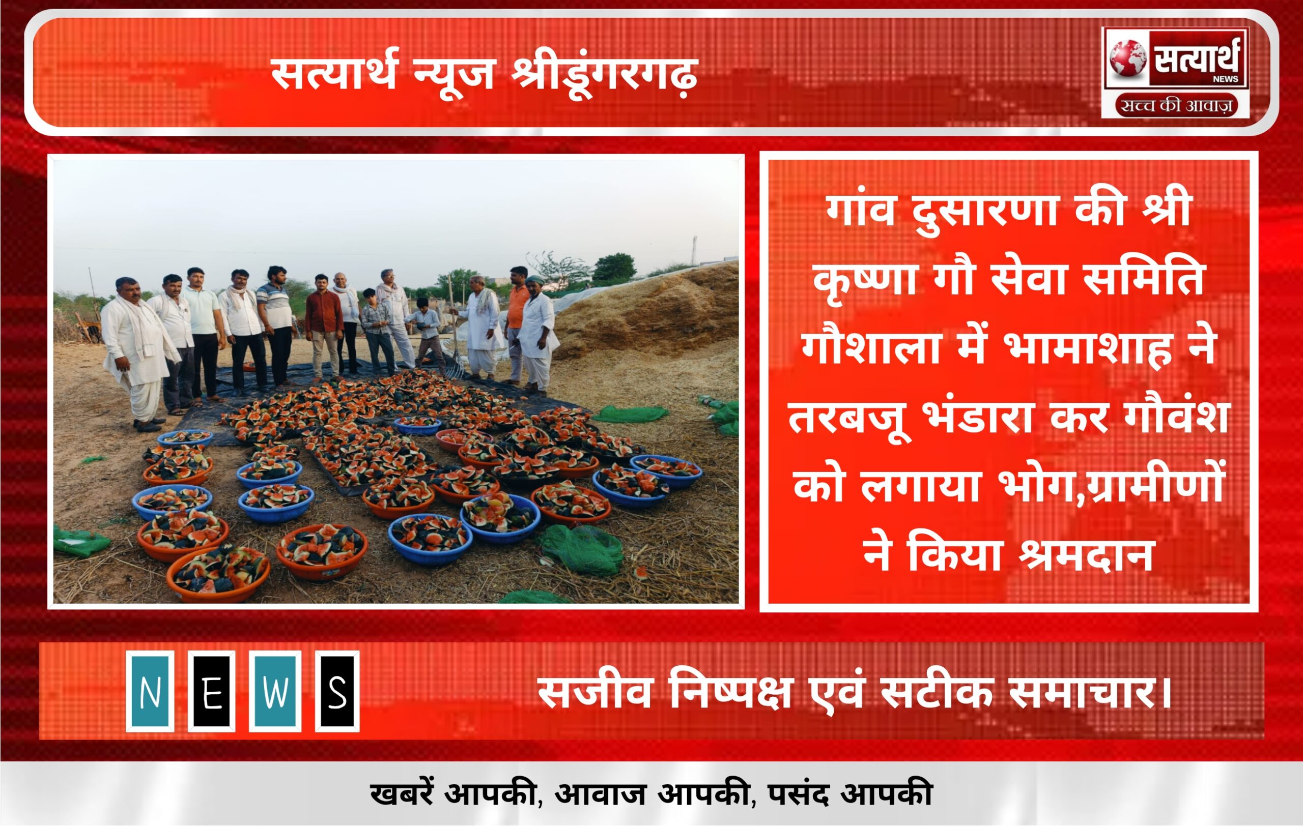 सत्यार्थ न्यूज श्रीडूंगरगढ़-सवांददाता मीडिया प्रभारी श्रीडूंगरगढ़ उपखंड के गांव दुसारणा की श्री कृष्णा गौ सेवा समिति गौशाला में नित्य तरबूज…