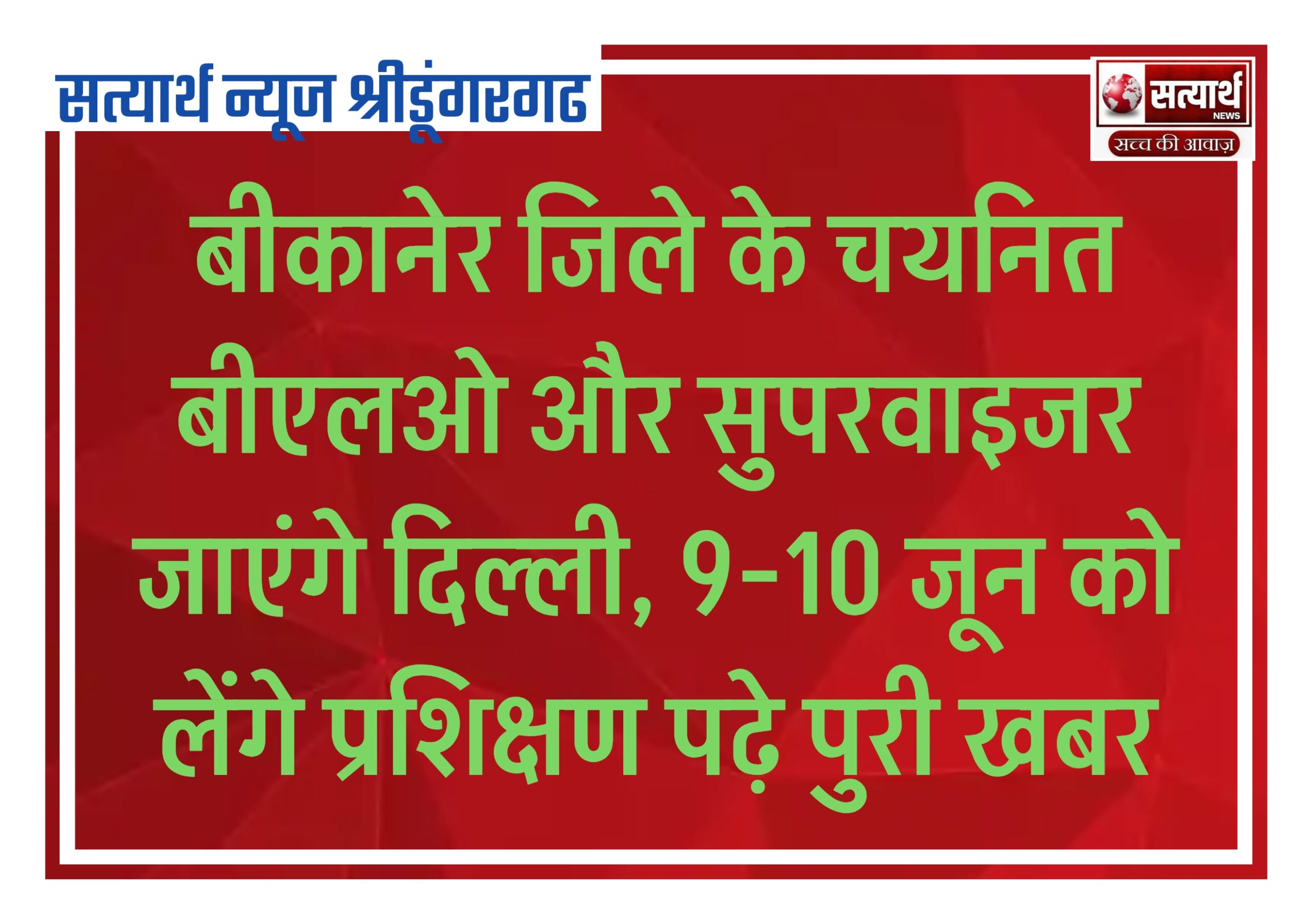 सत्यार्थ न्यूज श्रीडूंगरगढ़-सवांददाता ब्यूरो चीफ भारत निर्वाचन आयोग द्वारा राजस्थान के सभी विधानसभा क्षेत्रों से बीएलओ एवं सुपरवाइजर्स का दो…