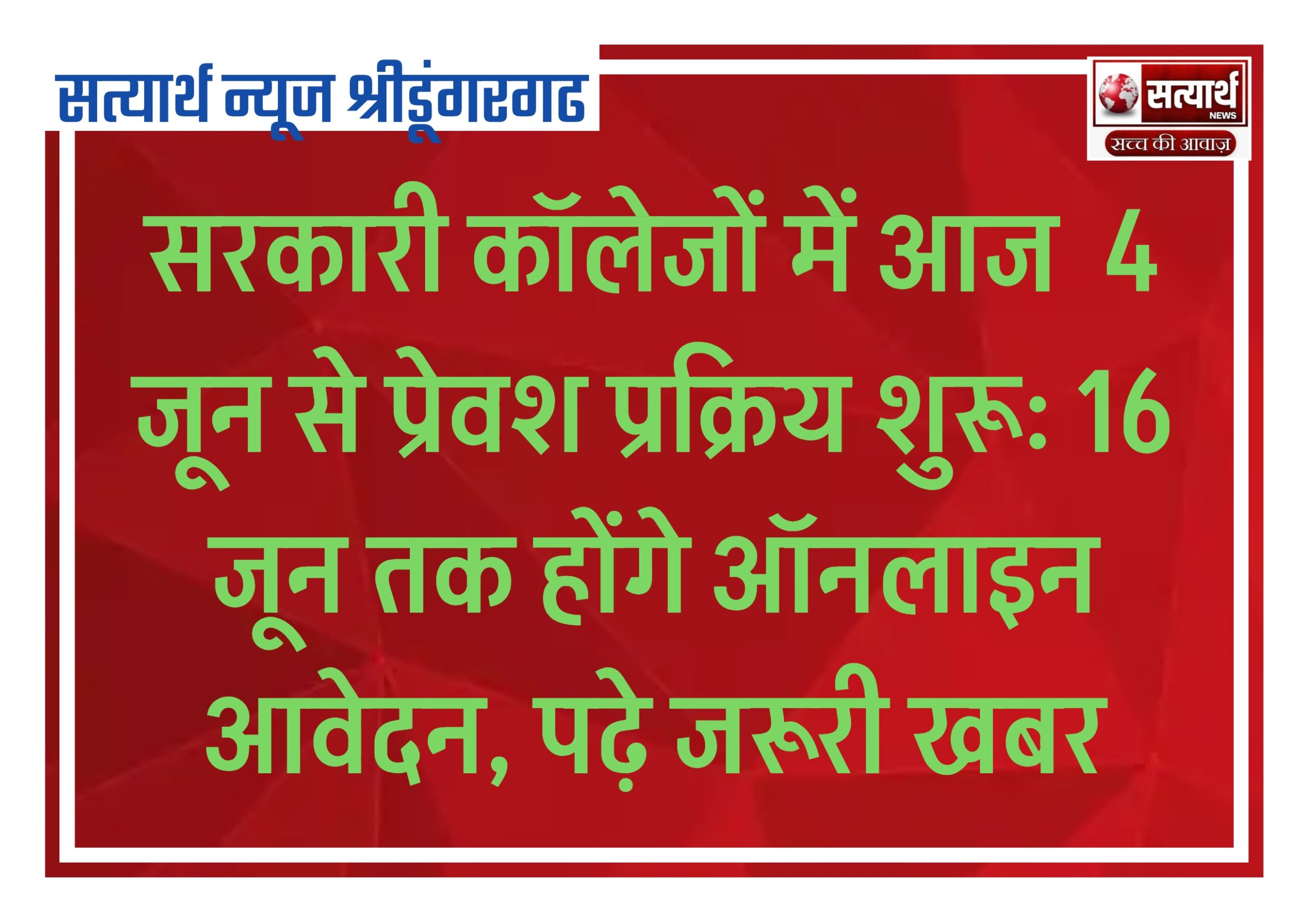 सत्यार्थ न्यूज श्रीडूंगरगढ़-सवांददाता ब्यूरो चीफ सरकारी कॉलेजों में स्नातक प्रथम सेमेस्टर में ऑनलाइन प्रवेश आज 4 जून से ऑनलाइन आवेदन…