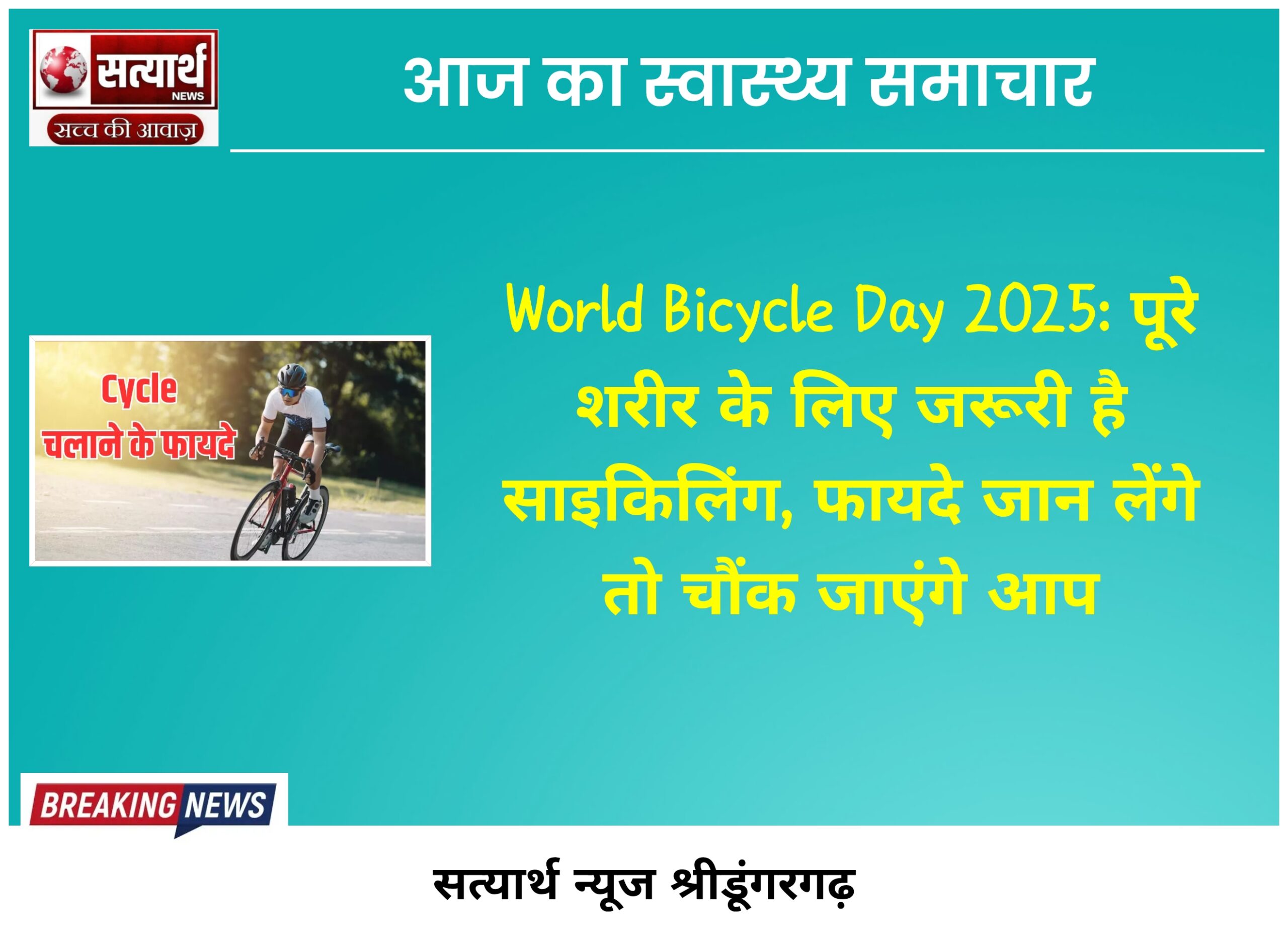 सत्यार्थ न्यूज श्रीडूंगरगढ़-सवांददाता मीडिया प्रभारी विश्व साइकिल दिवस 2025 3 जून को मनाया जाएगा। साइकिल चलाना पूरे शरीर के लिए…