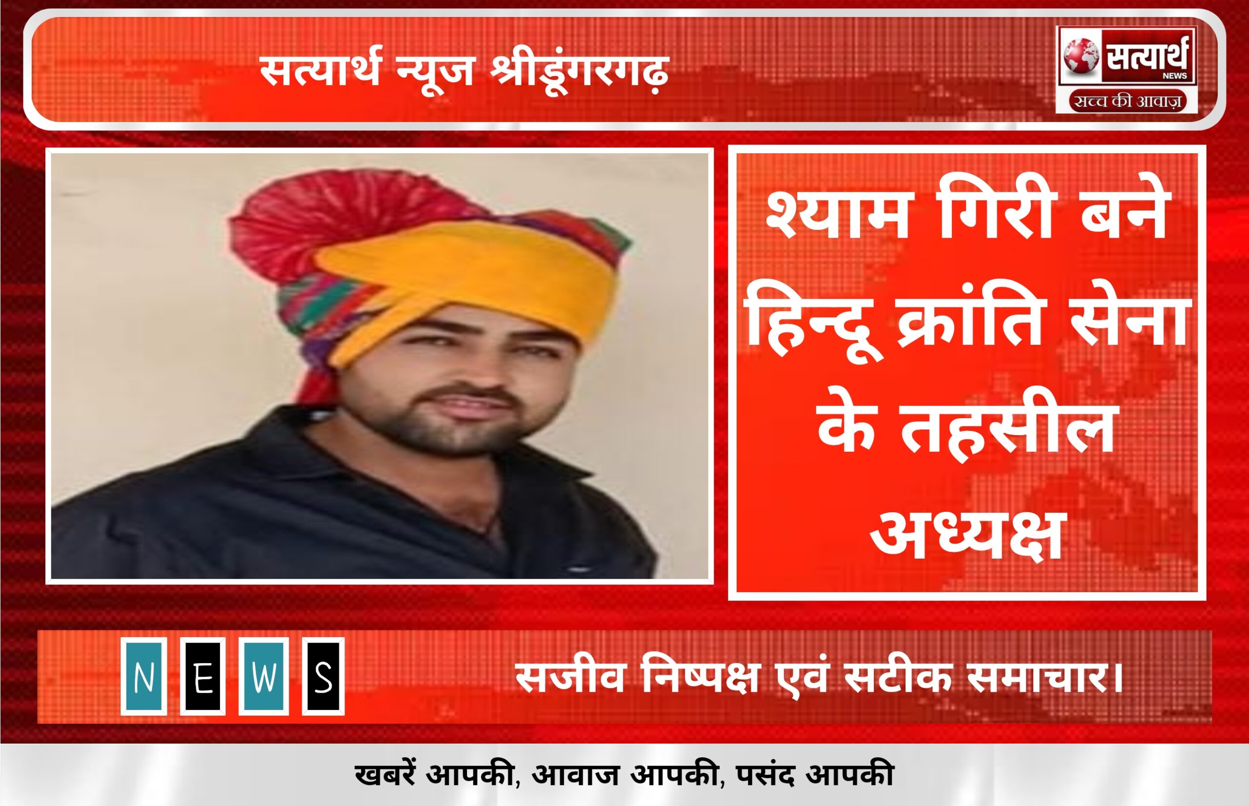 सत्यार्थ न्यूज श्रीडूंगरगढ़-सवांददाता ब्यूरो चीफ हिन्दू क्रान्ति सेना प्रदेशाध्यक्ष विकास डूमोली ने श्याम गिरी पुत्र ओम गिरी को श्रीडूंगरगढ़ तहसील…
