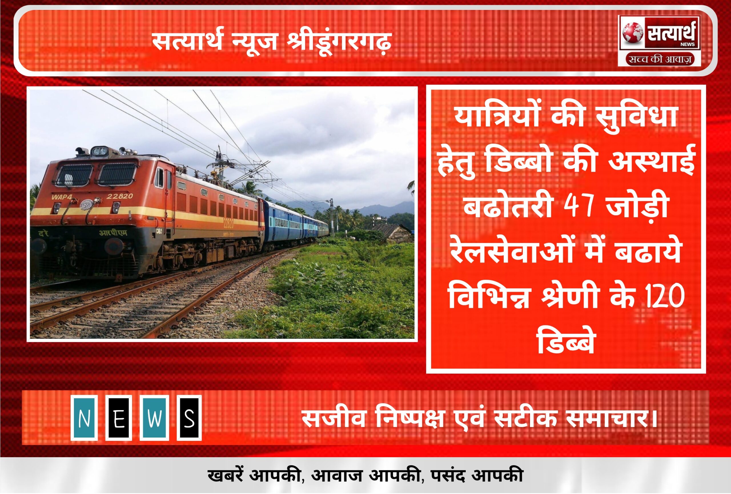 सत्यार्थ न्यूज श्रीडूंगरगढ़- सवांददाता ब्यूरो चीफ रेलवे द्वारा गर्मियों की छुटिटयों में अतिरिक्त यात्री यातायात को देखते हुए यात्रियों की…