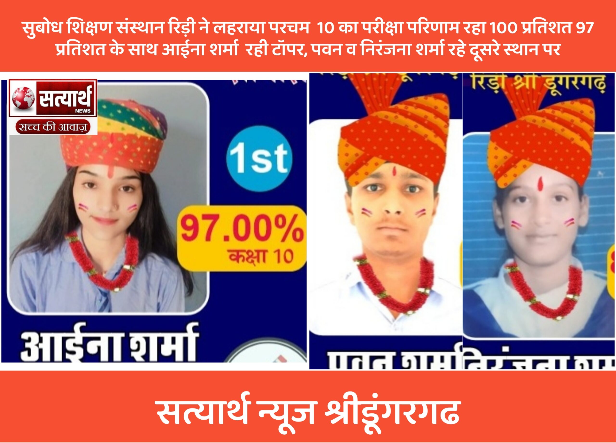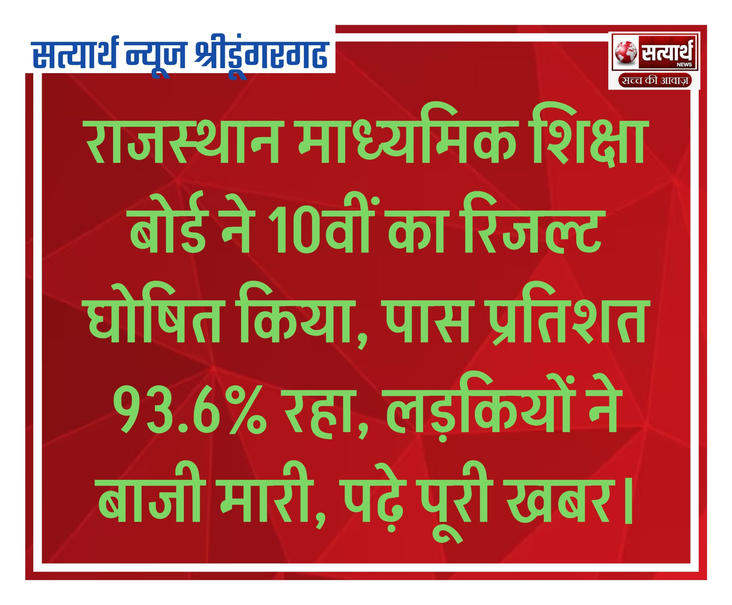 सत्यार्थ न्यूज श्रीडूंगरगढ़-सवांददाता ब्यूरो चीफ माध्यमिक शिक्षा बोर्ड, अजमेर ने आज 10वीं कक्षा का बहुप्रतीक्षित परिणाम जारी कर दिया है।…