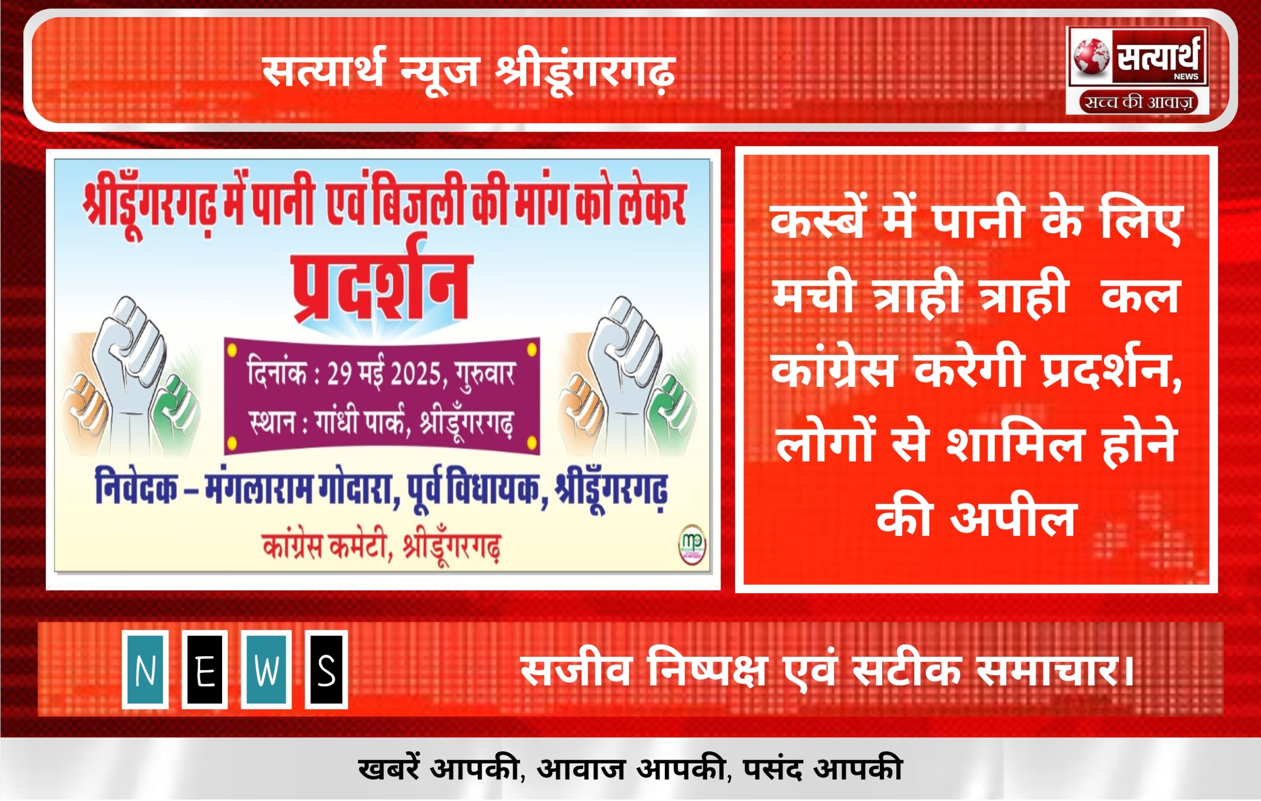सत्यार्थ न्यूज श्रीडूंगरगढ़-सवांददाता ब्यूरो चीफ श्रीडूंगरगढ़ के पुर्व विधायक मंगलाराम गोदारा के नेतृत्व में श्रीडूंगरगढ़ कांग्रेस पानी व बिजली की…