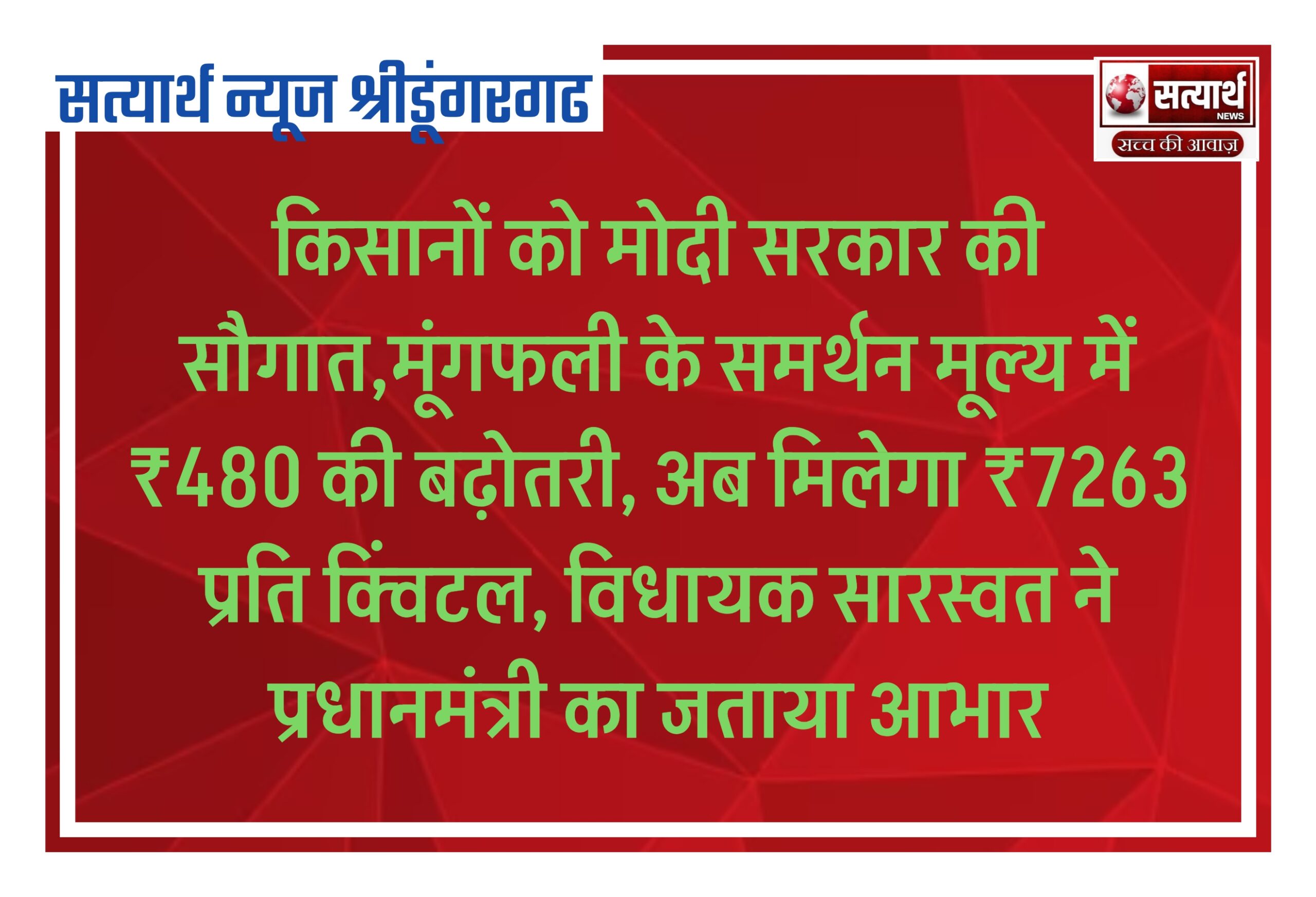 सत्यार्थ न्यूज श्रीडूंगरगढ़-सवांददाता ब्यूरो चीफ केंद्र सरकार द्वारा मूंगफली का न्यूनतम समर्थन मूल्य ₹480 प्रति क्विंटल बढ़ाकर ₹7263 प्रति क्विंटल…