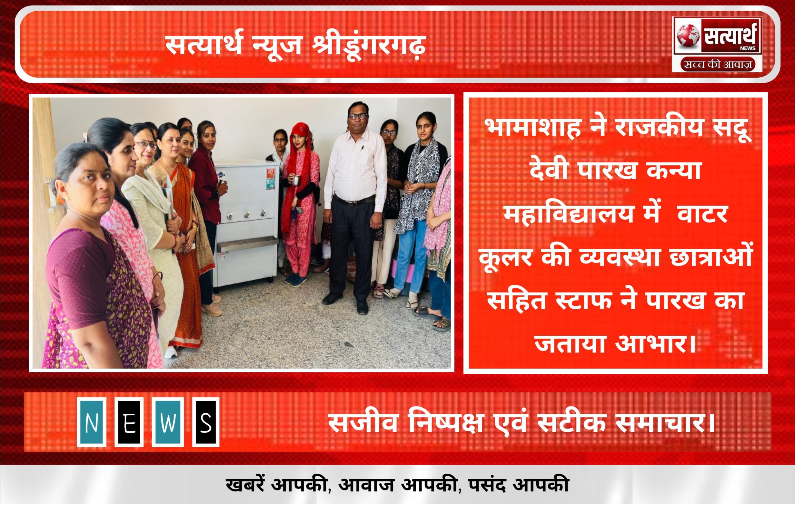 सत्यार्थ न्यूज श्रीडूंगरगढ़-सवांददाता ब्यूरो चीफ भीषण गर्मी के मौसम में राजकीय सदू देवी पारख कन्या महाविद्यालय श्रीडूंगरगढ़ में भामाशाह जतनलाल…