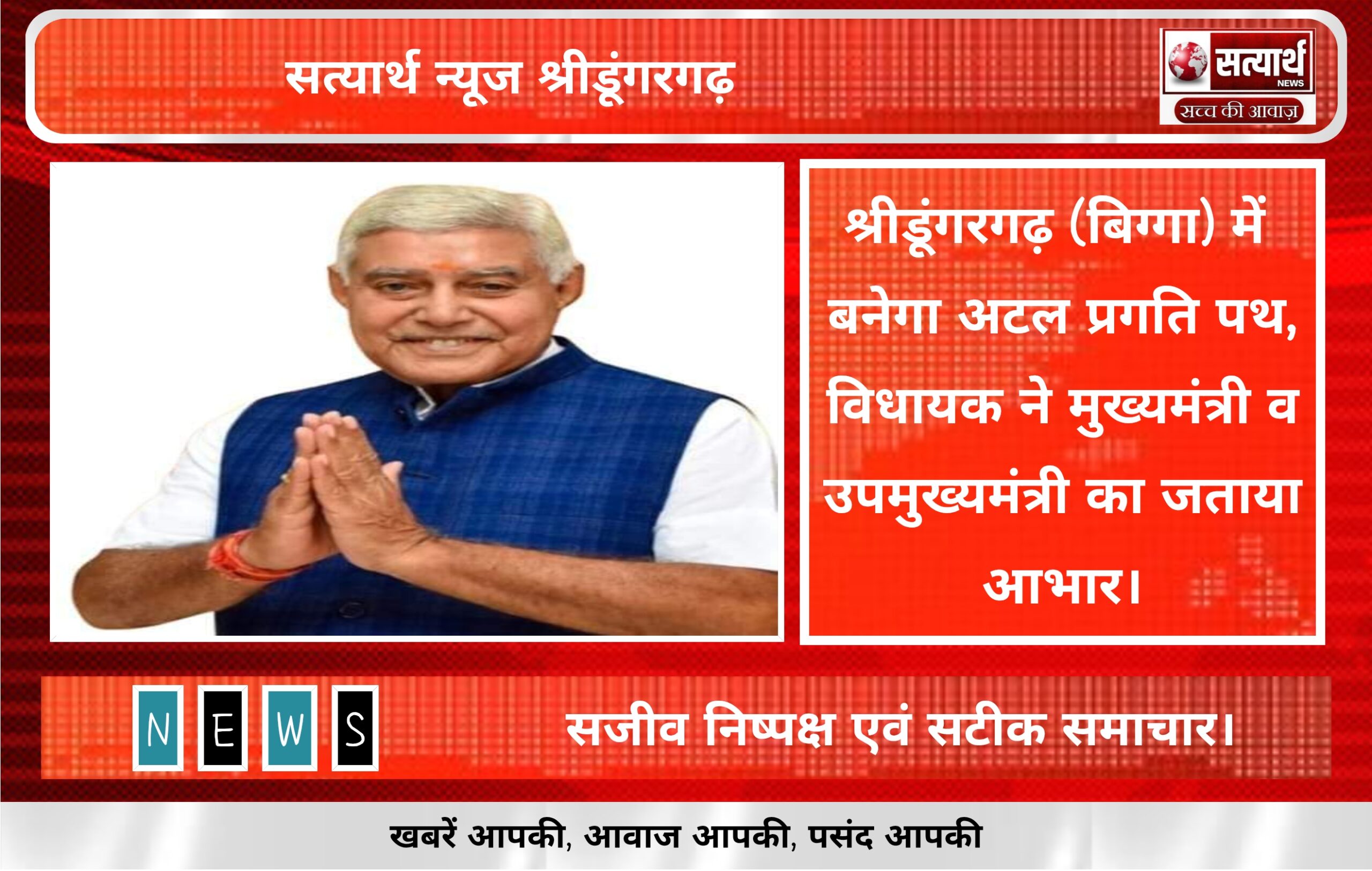 सत्यार्थ न्यूज श्रीडूंगरगढ़-सवांददाता ब्यूरो चीफ श्रीडूंगरगढ़ क्षेत्र के लिए एक महत्वपूर्ण विकास परियोजना के रूप में “अटल प्रगति पथ” की…