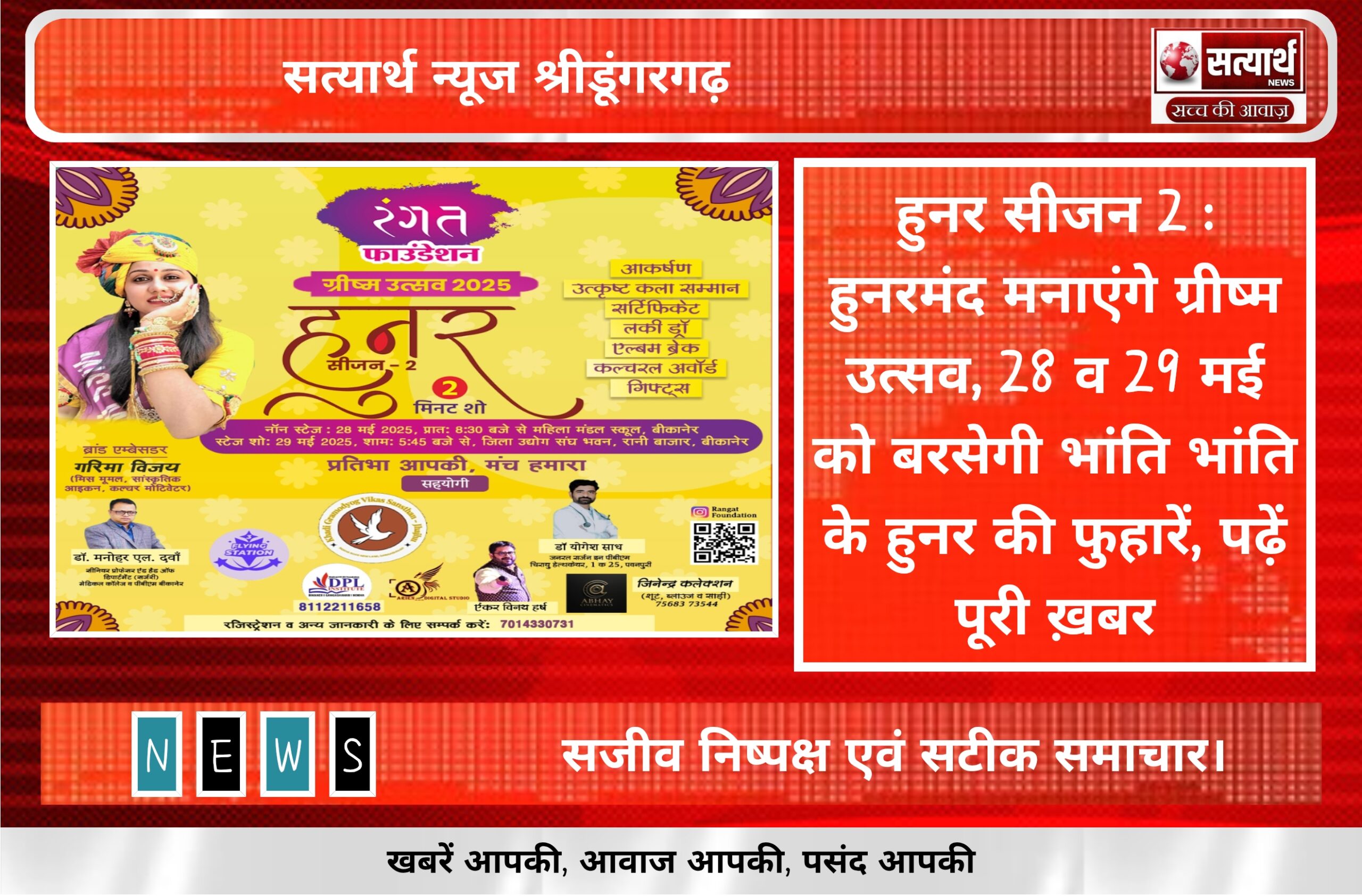 सत्यार्थ न्यूज श्रीडूंगरगढ़-सवांददाता ब्यूरो चीफ बीकानेर जिले व आसपास के टैलेंट्स के लिए 28-29 मई ख़ास तारीख होने जा रही…