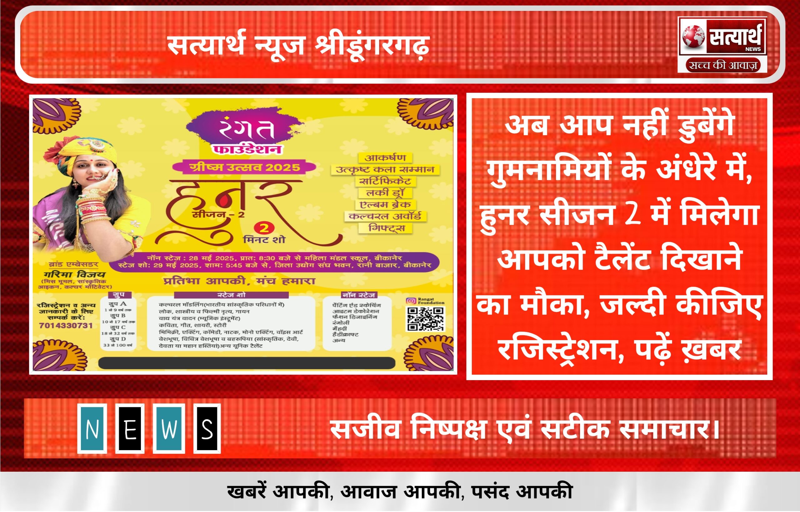 सत्यार्थ न्यूज श्रीडूंगरगढ़-सवांददाता ब्यूरो चीफ बीकानेर अभी ग्रीष्म उत्सव – हुनर सीजन 2 की रंगत में है। रंगत फाउंडेशन द्वारा…