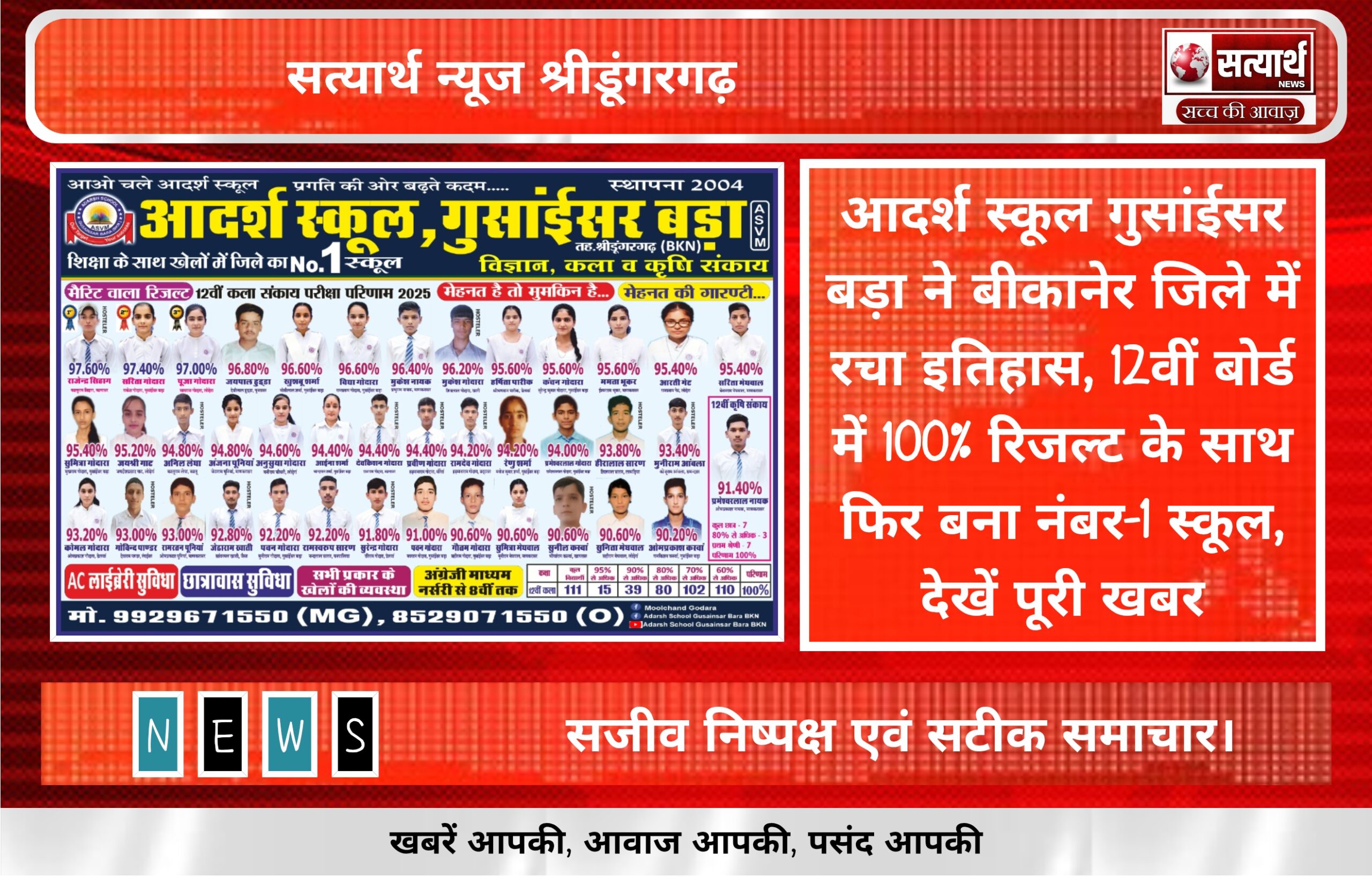 सत्यार्थ न्यूज श्रीडूंगरगढ़- सवांददाता ब्यूरो चीफ आदर्श स्कूल गुसांईसर बड़ा ने बीकानेर जिले में रचा इतिहास, 12वीं बोर्ड में 100%…