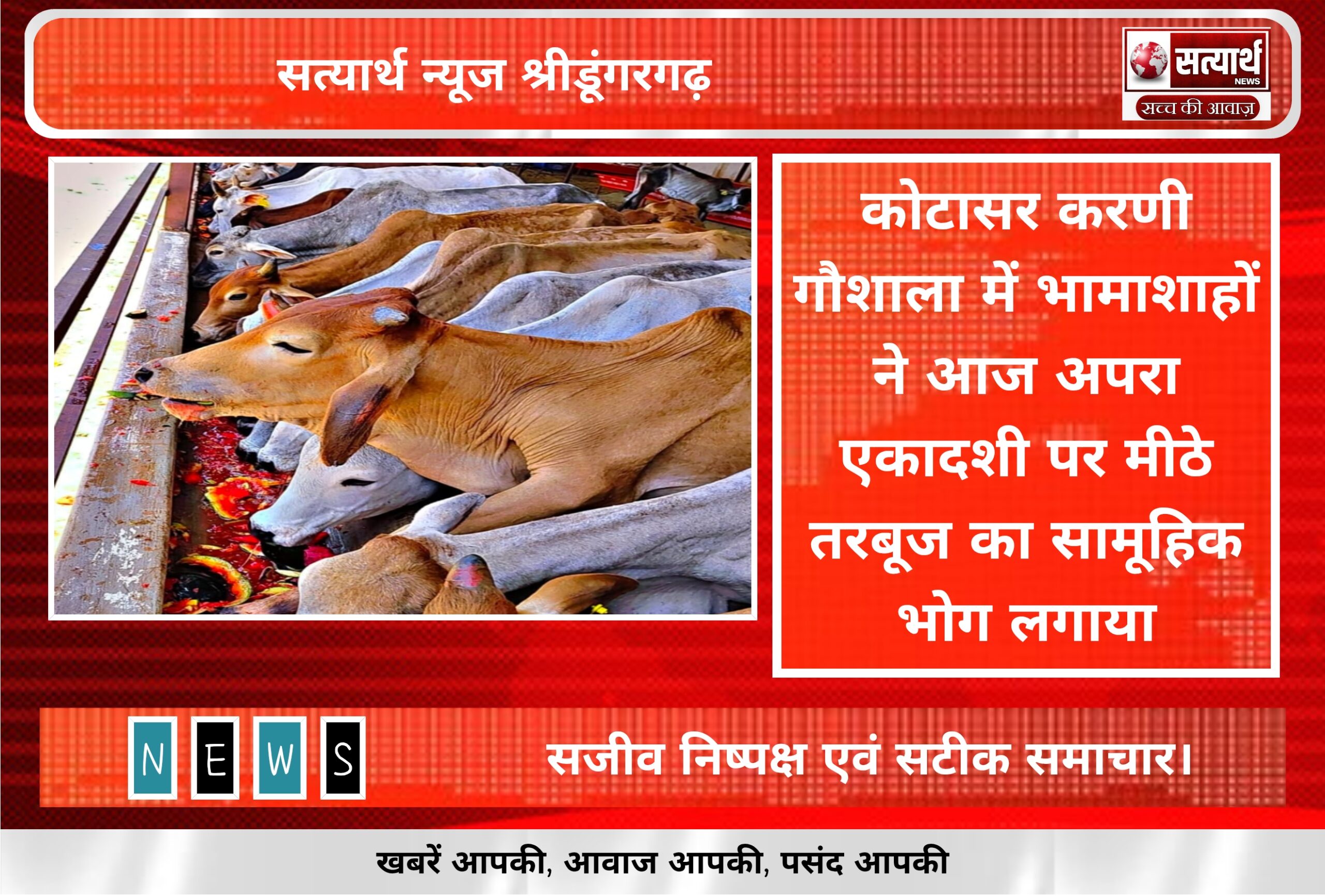 सत्यार्थ न्यूज श्रीडूंगरगढ़-सवांददाता ब्यूरो चीफ कोटासर करणी गौशाला में आज अपरा एकादशी पर₹1100 पहलाद नागल सुथार दुलचासर हाल बड़ोदरा,₹ 1100…