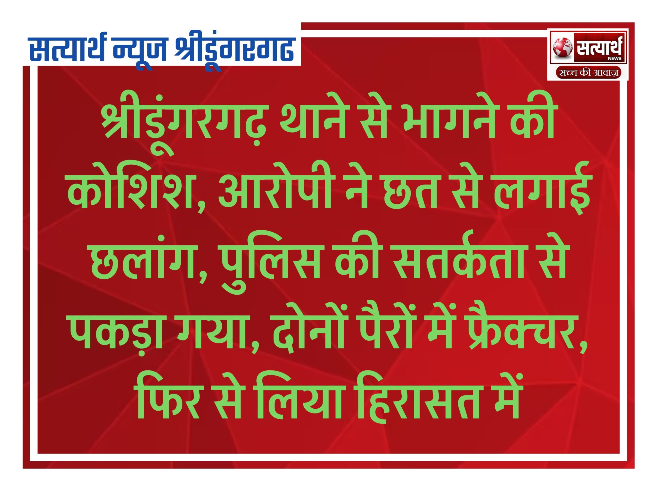 सत्यार्थ न्यूज श्रीडूंगरगढ़ -सवांददाता ब्यूरो चीफ श्रीडूंगरगढ़ पुलिस थाने से एक आरोपी ने पुलिस हिरासत से भागने का प्रयास किया…
