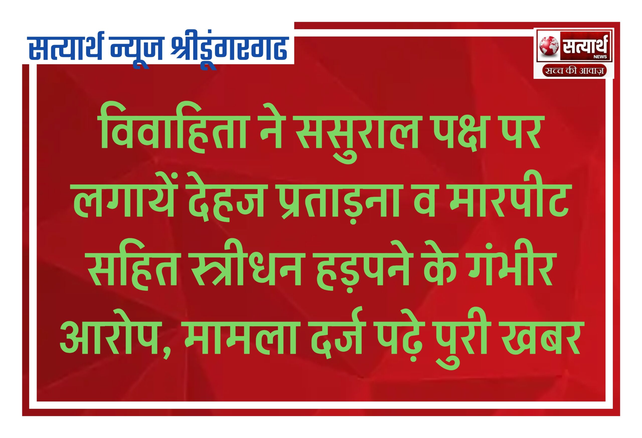 सत्यार्थ न्यूज श्रीडूंगरगढ़-सवांददाता ब्यूरो चीफ क्षेत्र की एक विवाहिता ने अपने ससुराल पक्ष पर दहेज प्रताडऩा और मारपीट का आरोप…