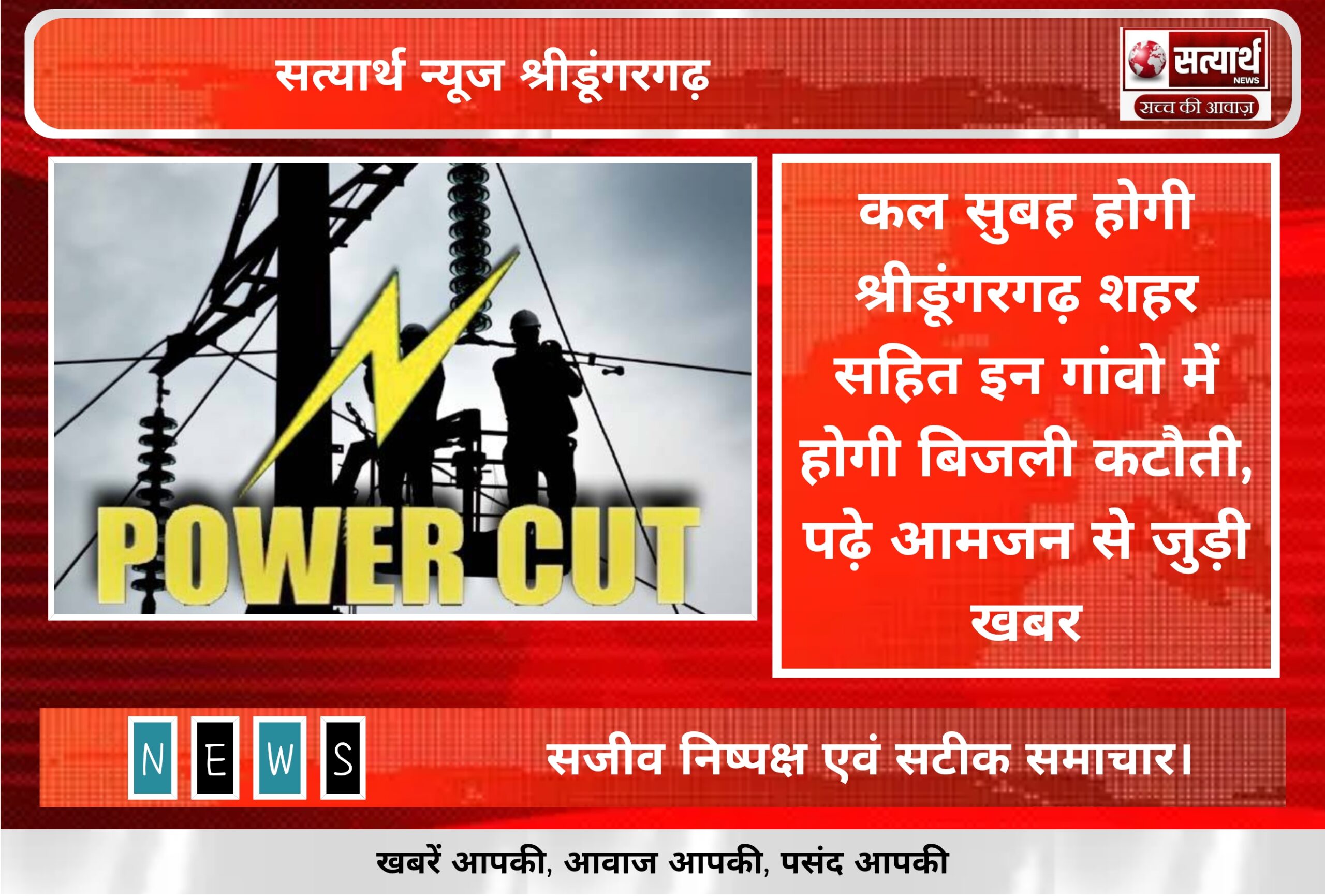 सत्यार्थ न्यूज श्रीडूंगरगढ़-सवांददाता ब्यूरो चीफ कल बुधवार को सुबह 7:00बजे से 9 बजे तक कस्बेवासियों को बिजली कटौती का सामना…