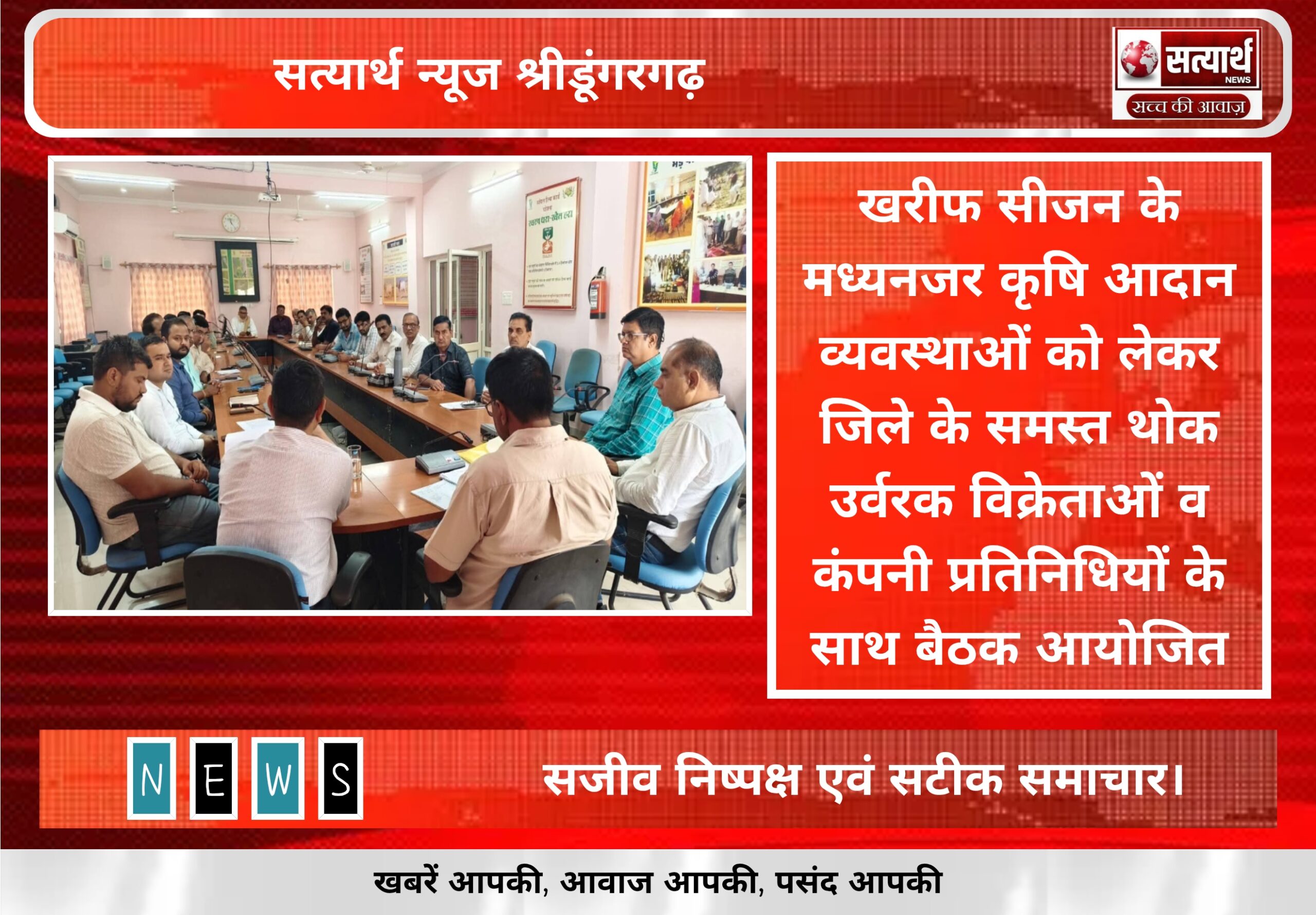 सत्यार्थ न्यूज श्रीडूंगरगढ़-सवांददाता ब्यूरो चीफ कृषि आदान विक्रेता बीज,उर्वरक कंट्रोल ऑर्डर व पेस्टीसाइड नियमों में उल्लेखित प्रावधान अनुसार ही कृषि…