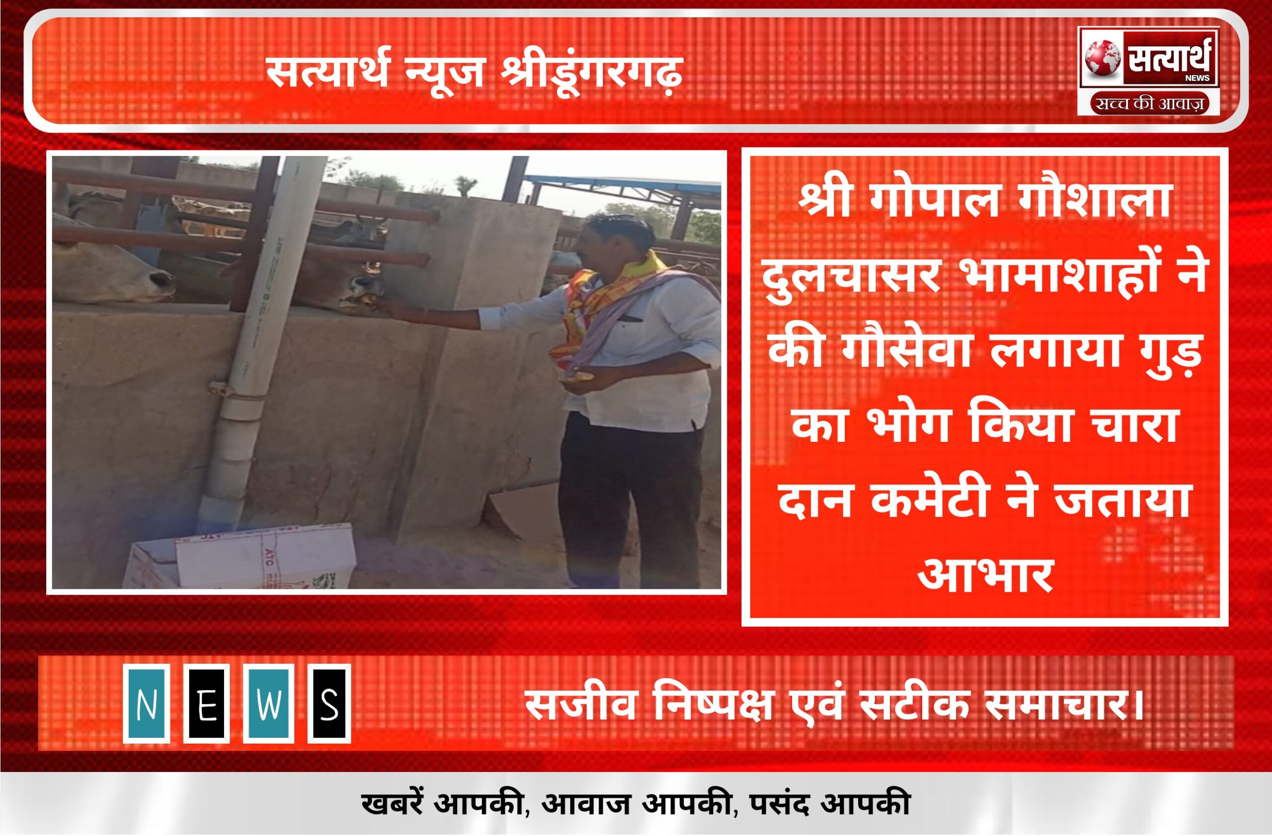 सत्यार्थ न्यूज श्रीडूंगरगढ़- सवांददाता ब्युरो चीफ श्री गोपाल गौशाला दुलचासर में गौ प्रेमी चौधरी रेखाराम महिया ने गोमाता एवं गोवंश…