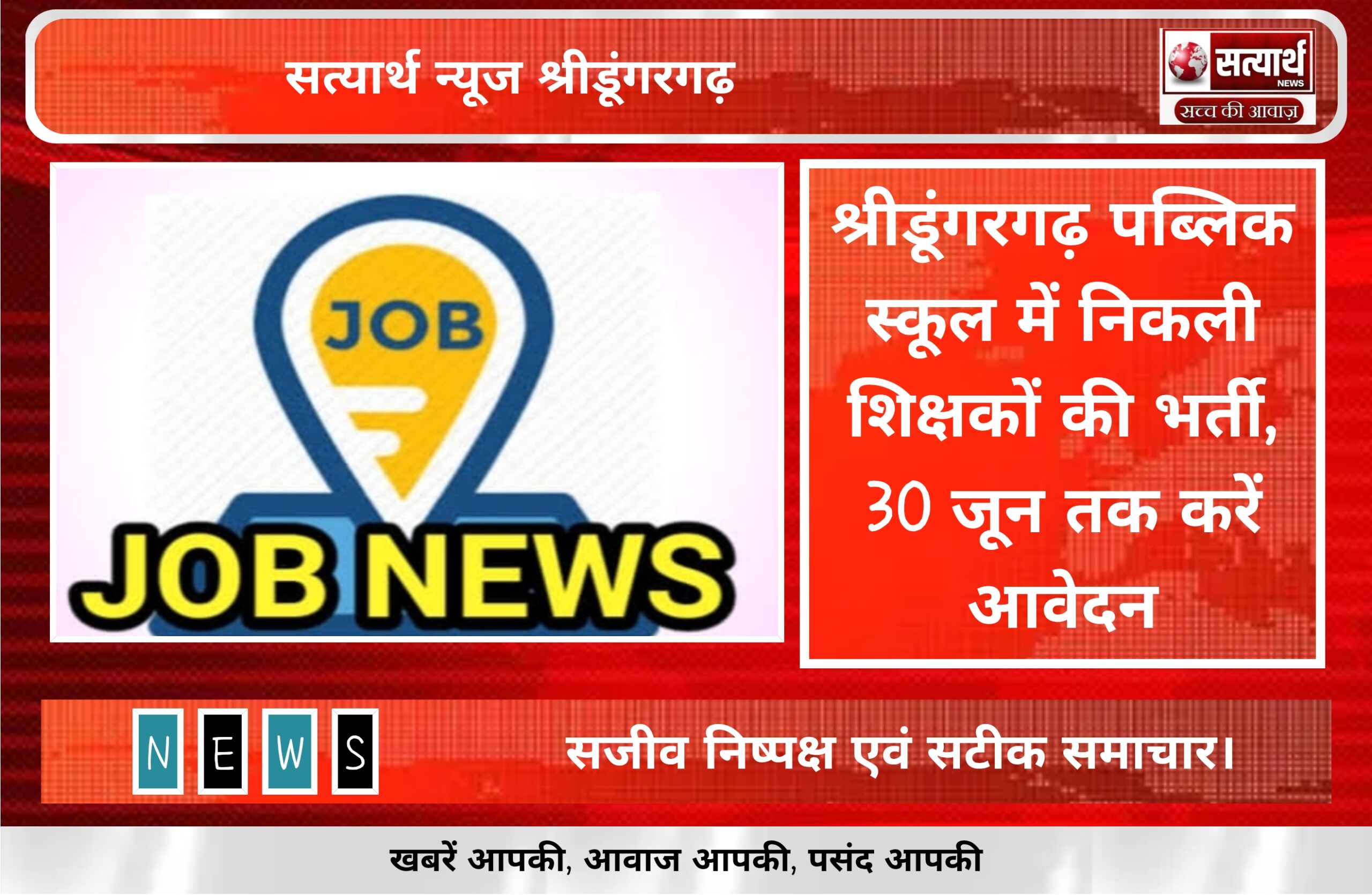 सत्यार्थ न्यूज श्रीडूंगरगढ़-सवांददाता ब्यूरो चीफ श्रीडूंगरगढ़ पब्लिक स्कूल में प्री प्राइमरी से लेकर कक्षा आठवीं तक शिक्षकों की भर्ती निकली…