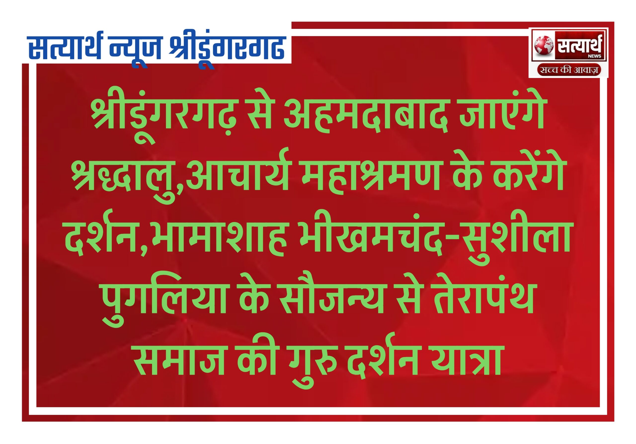 सत्यार्थ न्यूज श्रीडूंगरगढ-सवांददाता ब्यूरो चीफ श्रीडूंगरगढ़ से जैन समाज के श्रद्धालुओं का एक दल आगामी 19 सितंबर को जैन धर्मगुरु…