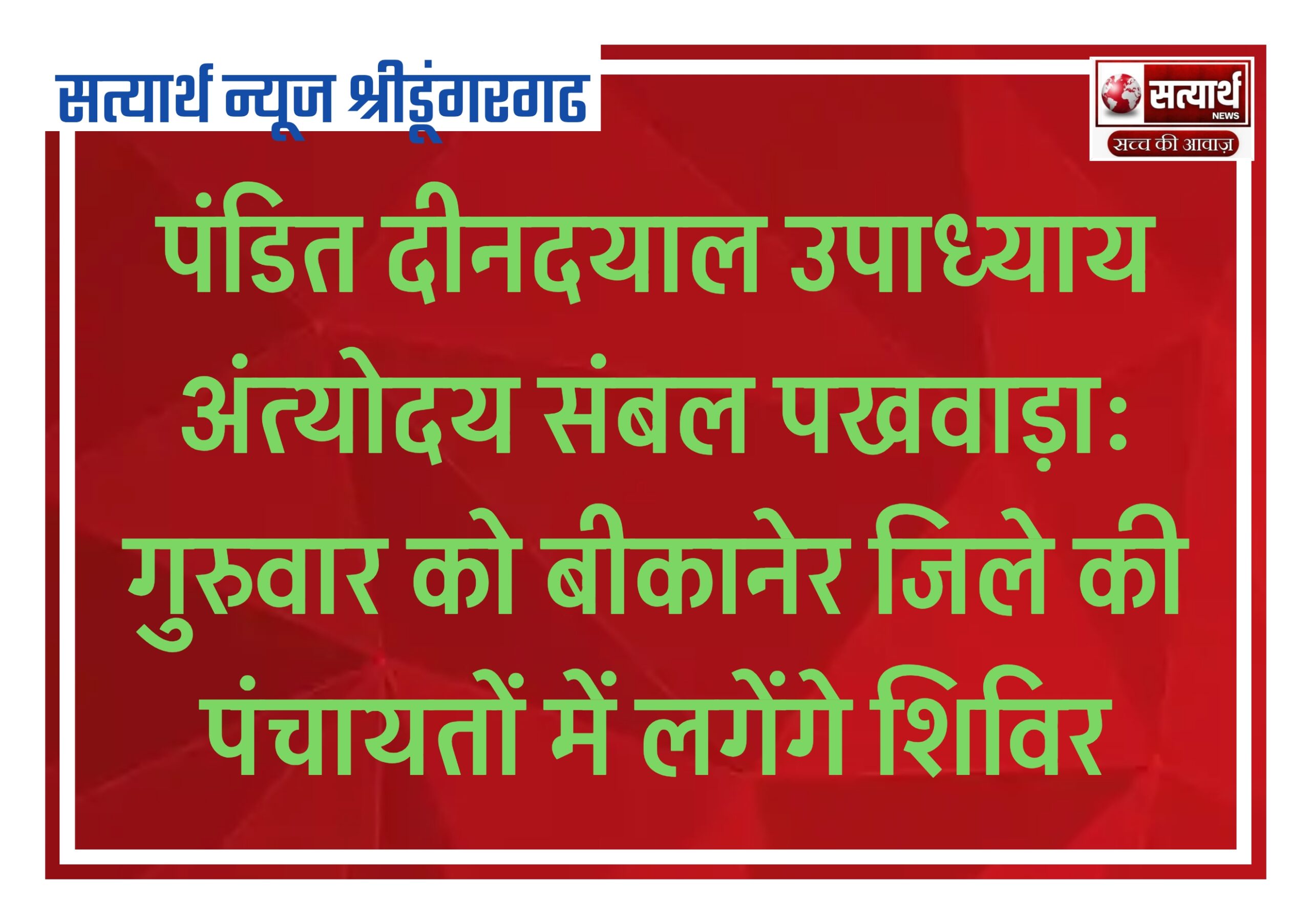 सत्यार्थ न्यूज श्रीडूंगरगढ-सवांददाता ब्यूरो चीफ पंडित दीनदयाल उपाध्याय अंत्योदय संबल पखवाड़ा के तहत गुरुवार को जिले भर की विभिन्न ग्राम…