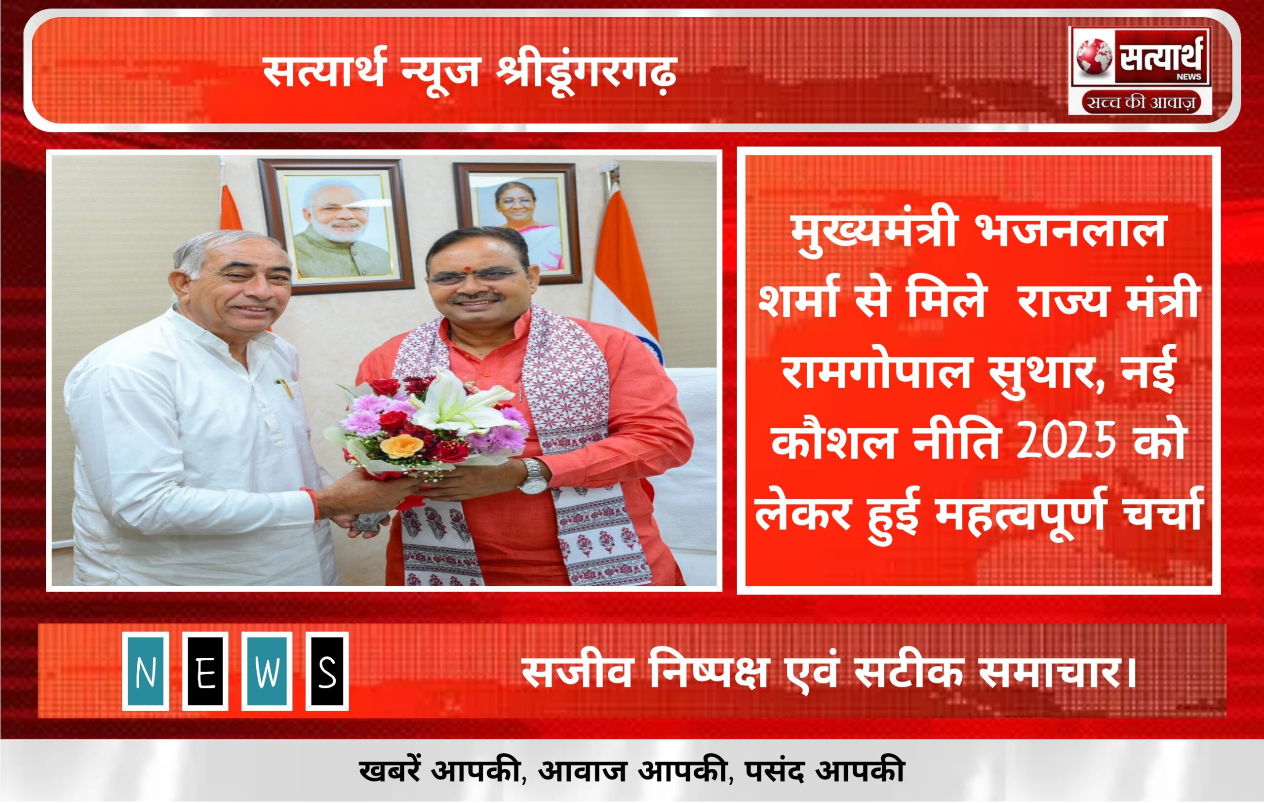 सत्यार्थ न्यूज श्रीडूंगरगढ-सवांददाता ब्यूरो चीफ श्री विश्वकर्मा कौशल विकास बोर्ड के अध्यक्ष रामगोपाल सुथार ने मुख्यमंत्री निवास पर मुख्यमंत्री भजनलाल…