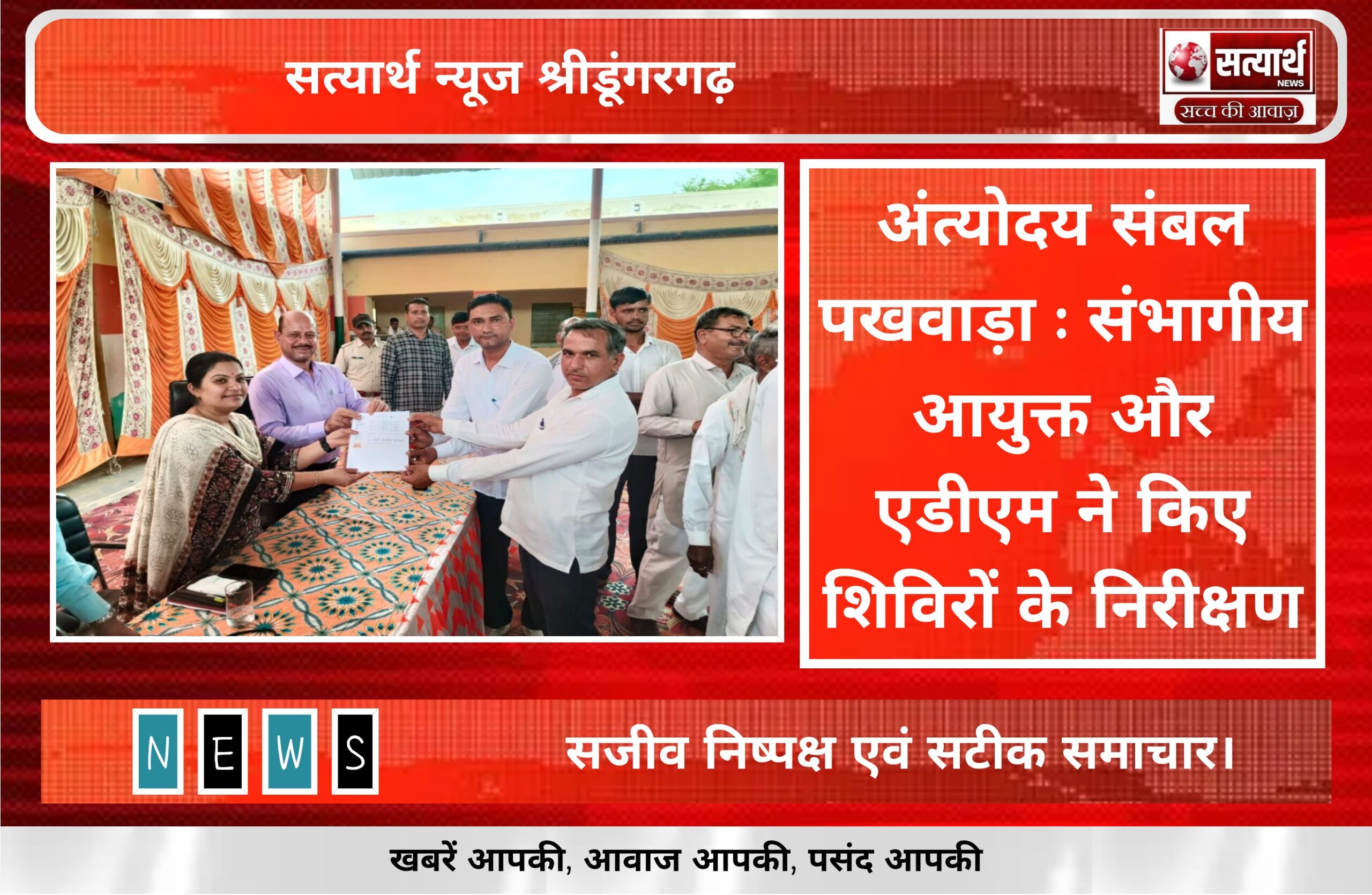 सत्यार्थ न्यूज श्रीडूंगरगढ-सवांददाता ब्यूरो चीफ पंडित दीनदयाल उपाध्याय अंत्योदय संबल पखवाड़ा के तहत शनिवार को श्रीडूंगरगढ़ क्षेत्र में आयोजित शिविरों…