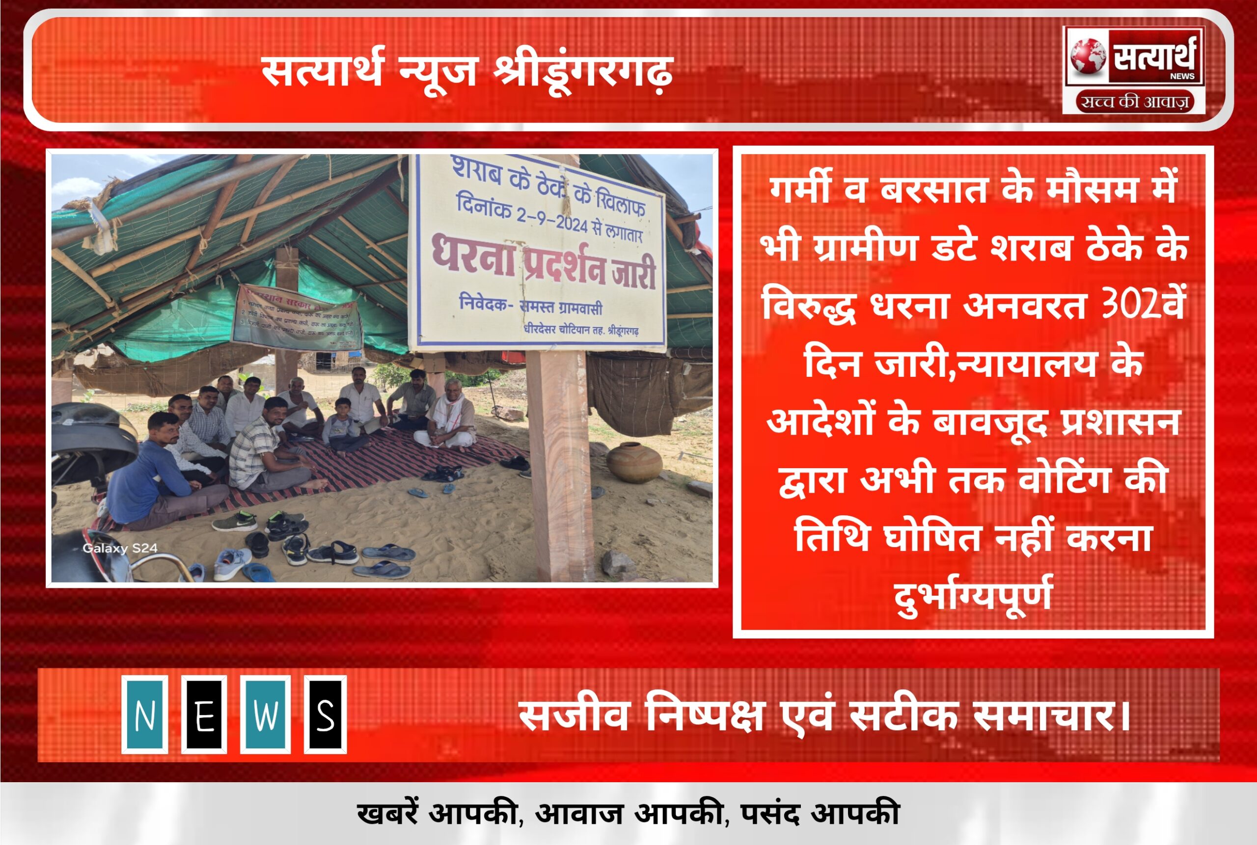 सत्यार्थ न्यूज श्रीडूंगरगढ-सवांददाता ब्यूरो चीफ क्षेत्र के गांव धीरदेसर चोटियान में शराब ठेका बन्द करने की मांग को लेकर 302वें…