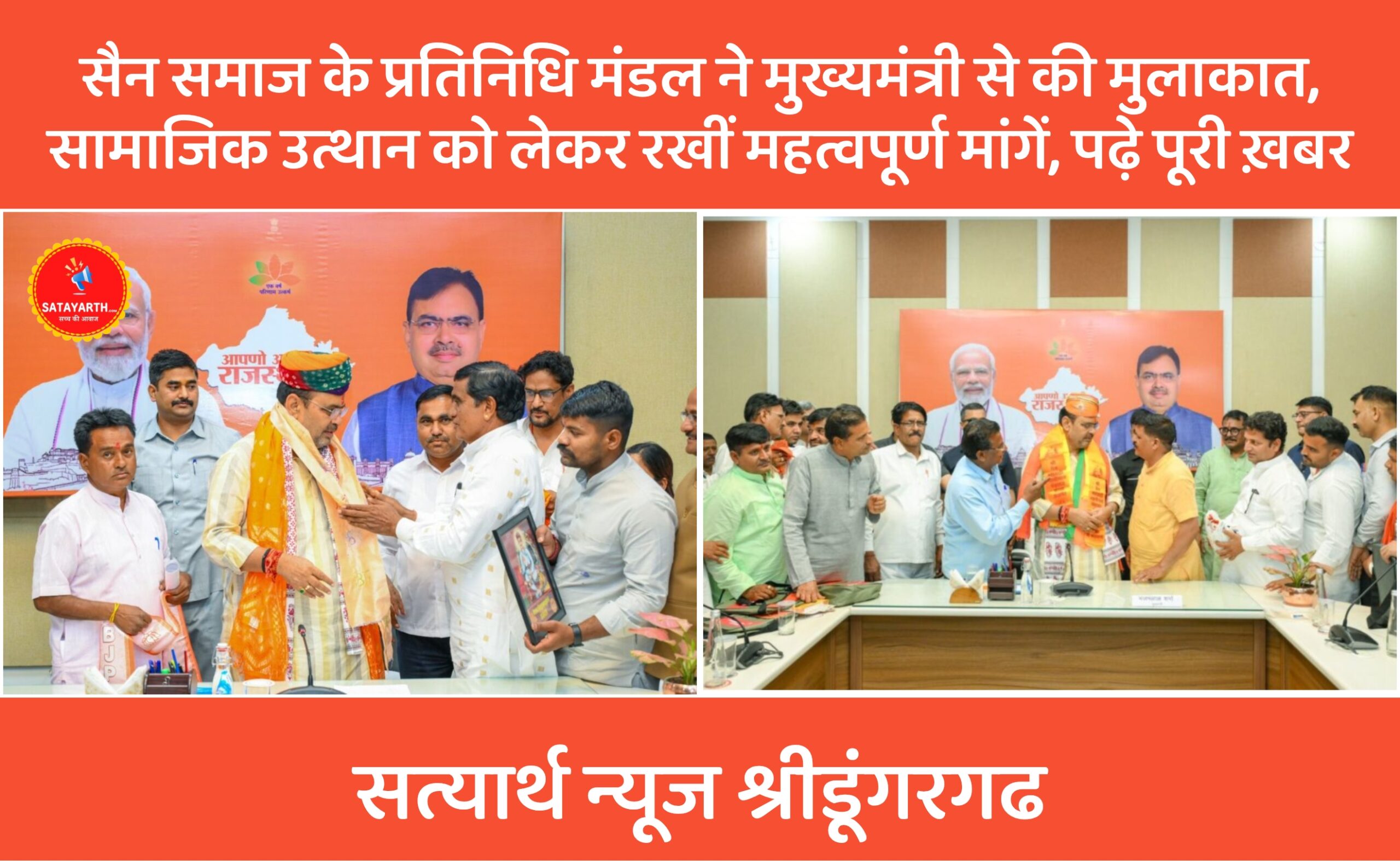 सत्यार्थ न्यूज श्रीडूंगरगढ़-सवांददाता ब्युरो चीफ शुक्रवार को सैन समाज के प्रतिनिधि मंडल ने मुख्यमंत्री आवास पर मुलाकात कर मुख्यमंत्री भजनलाल…