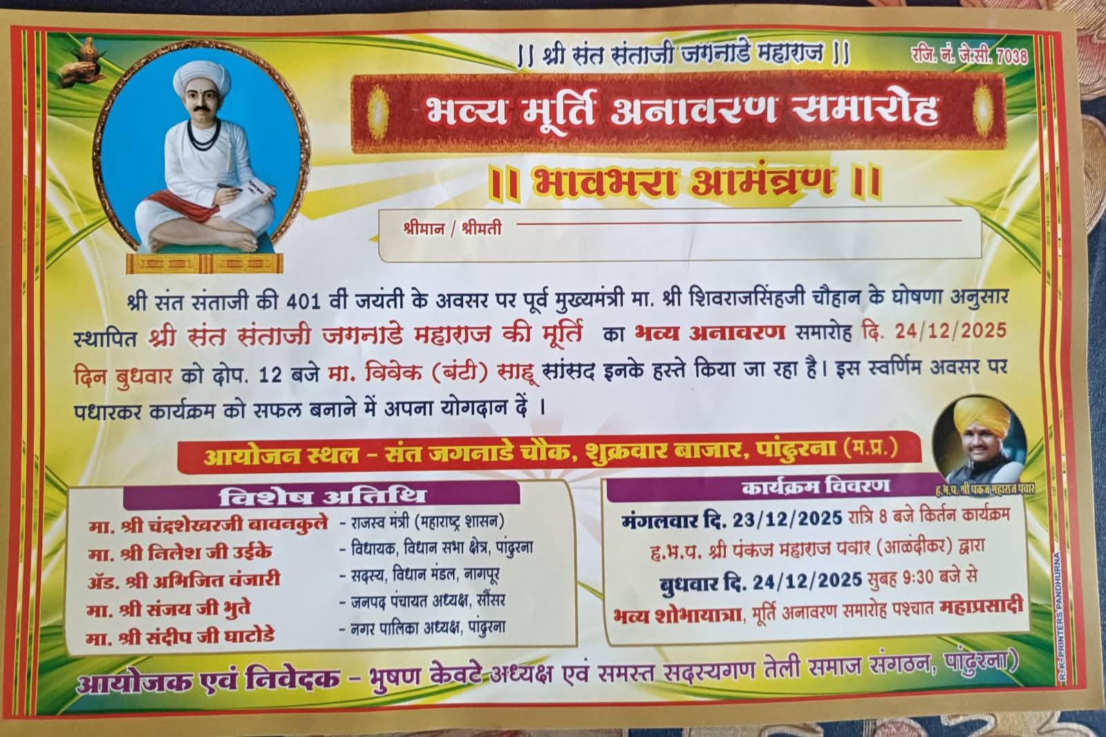 पांढुरना में 24 दिसंबर को श्री संत संताजी जगनाडे महाराज की प्रतिमा का होगा अनावरण संवाददाता धनंजय जोशी जिला पांढुरना…