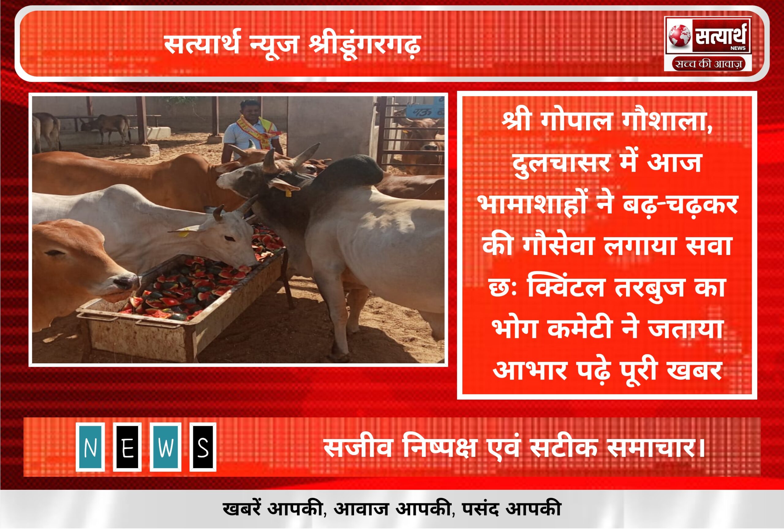 श्री गोपाल गौशाला, दुलचासर में आज भामाशाहों ने बढ़-चढ़कर की गौसेवा लगाया सवा छः क्विंटल तरबुज का भोग कमेटी ने जताया आभार पढ़े पूरी खबर