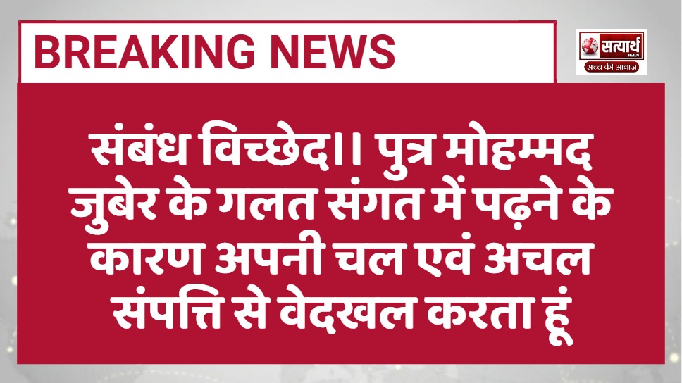 संबंध विच्छेद।। पुत्र मोहम्मद जुबेर के गलत संगत में पढ़ने के कारण अपनी चल एवं अचल संपत्ति से वेदखल करता हूं
