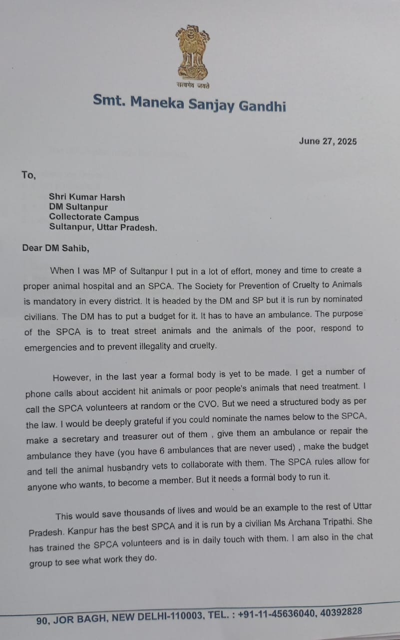 सुल्तानपुर की पूर्व सांसद मेनका गांधी फिर हुई सक्रिय डीएम को लिखा पत्र, पशु क्रूरता निवारण सोसाइटी गठन को बताया…