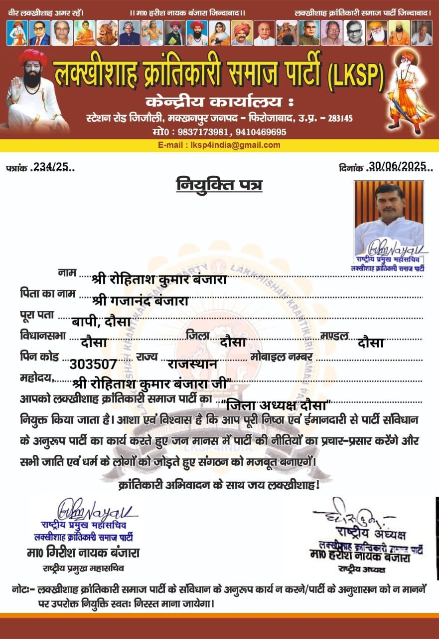राजस्थान प्रदेश के दौसा जिला के रोहिताश कुमार बंजारा को दौसा जिला अध्यक्ष नियुक्त किया गया है।