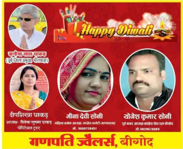 गणपति ज्वेलर्स की तरफ से समस्त देशवासियों को दीपावली पर्व की हार्दिक शुभकामनाएं सत्यार्थ न्यूज़ भीलवाड़ा अब्दुल सलाम रंगरेज