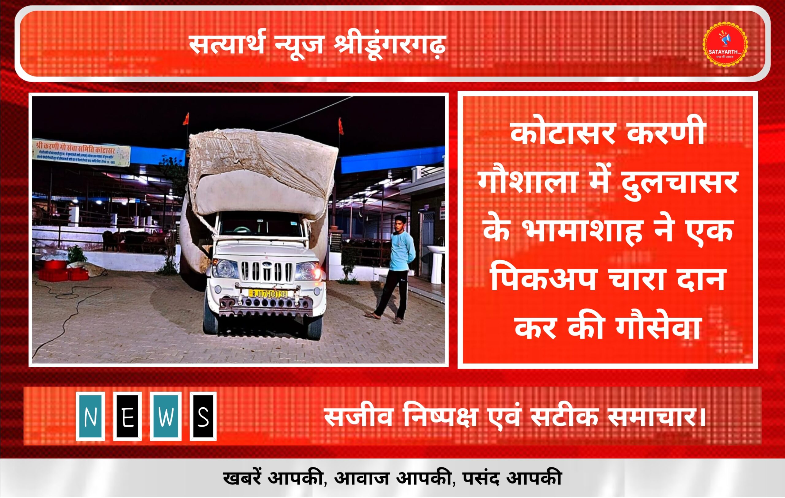 सत्यार्थ न्यूज श्रीडूंगरगढ़-सवांददाता मीडिया प्रभारी गौशाला के भामाशाह रूघलाल,सुशील कुमार मूंधड़ा दुलचासर के द्वारा आज अपने फार्म हाउस से एक…