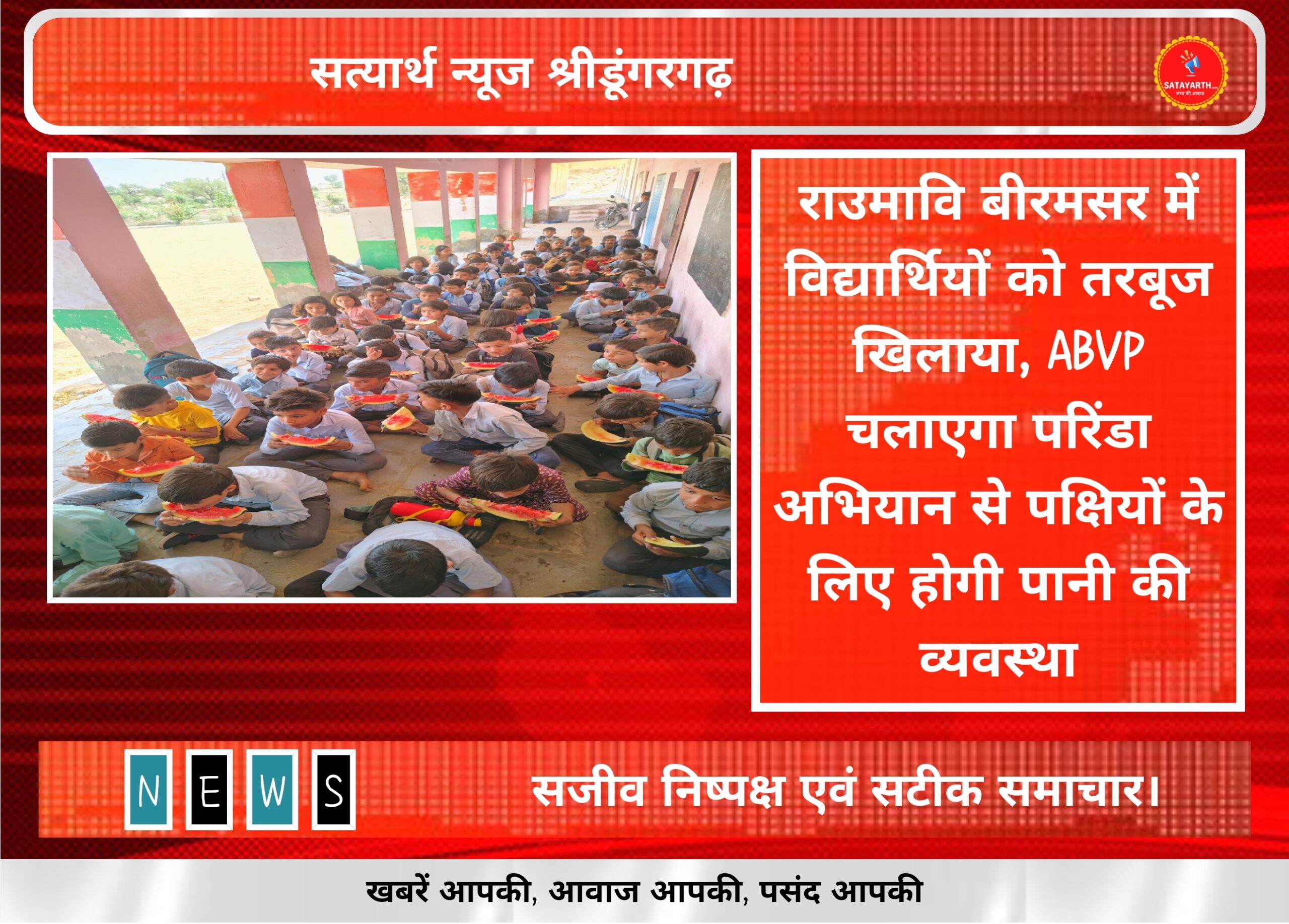 सत्यार्थ न्यूज श्रीडूंगरगढ़-सवांददाता ब्युरो चीफ आज क्षेत्र के गांव बिरमसर राजकीय उच्च प्राथमिक विद्यालय बीरमसर में भीषण गर्मी को देखते…