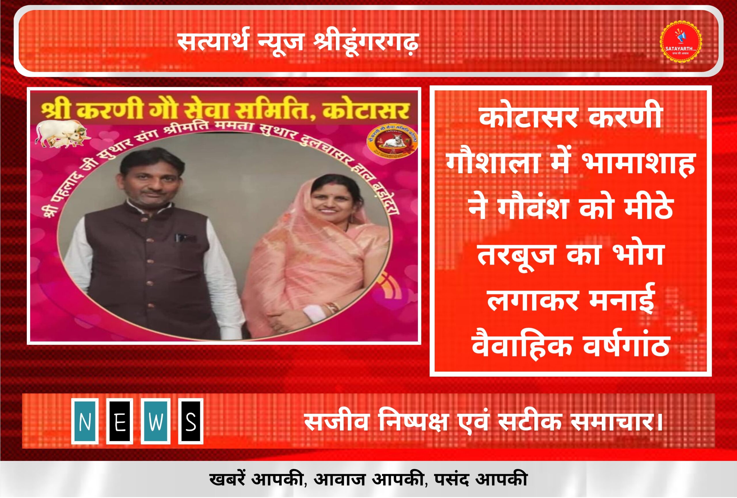 सत्यार्थ न्यूज श्रीडूंगरगढ़-सवांददाता मीडिया प्रभारी गौशाला के भामाशाह परम गौ भक्त पहलाद नागल सुथार एवं जीवन संगिनी श्रीमती ममता सुथार…