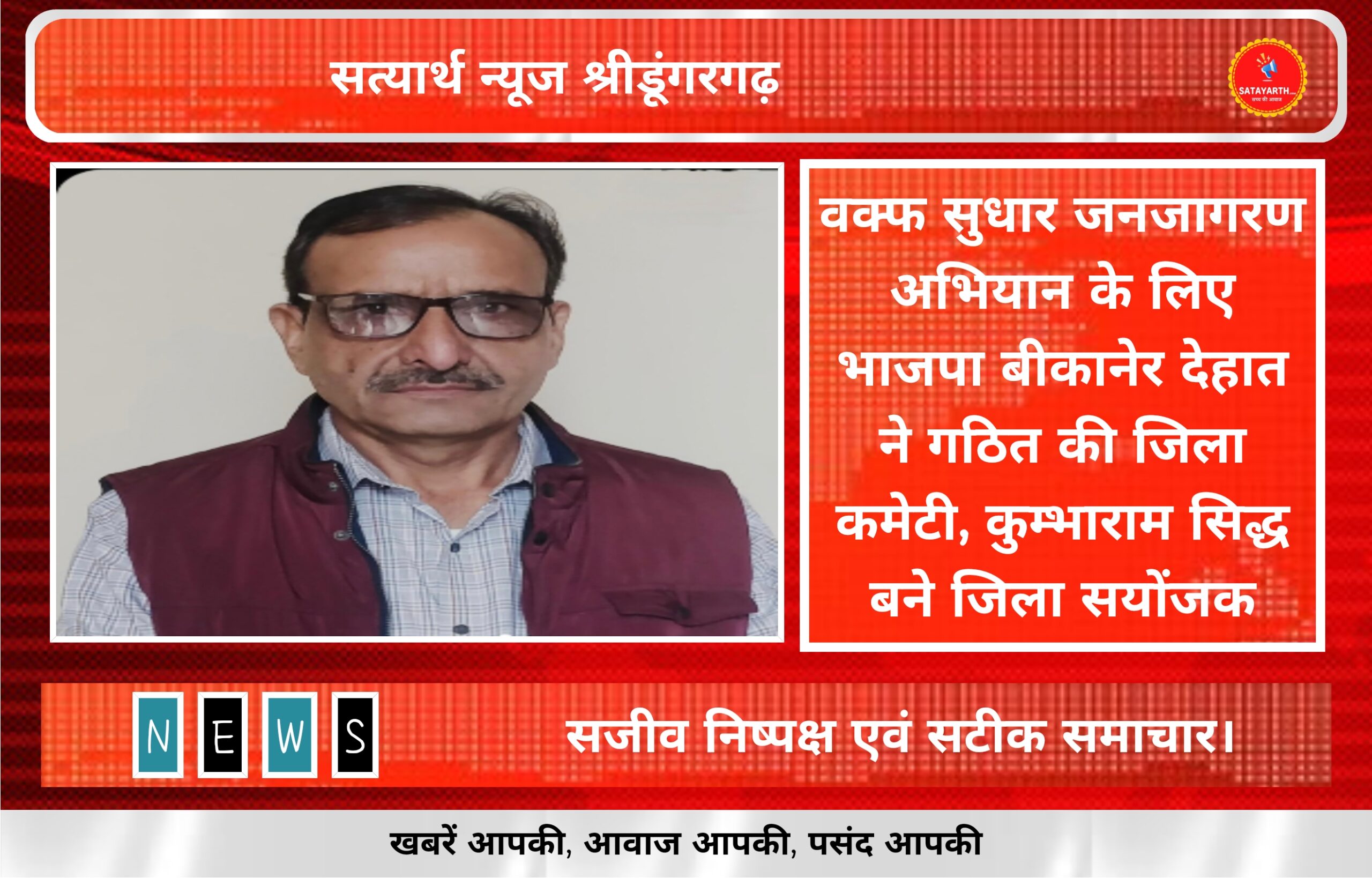 सत्यार्थ न्यूज श्रीडूंगरगढ़-सवांददाता ब्युरो चीफ भारतीय जनता पार्टी बीकानेर देहात द्वारा वक्फ सुधार जनजागरण अभियान के तहत जिला स्तरीय कमेटी…