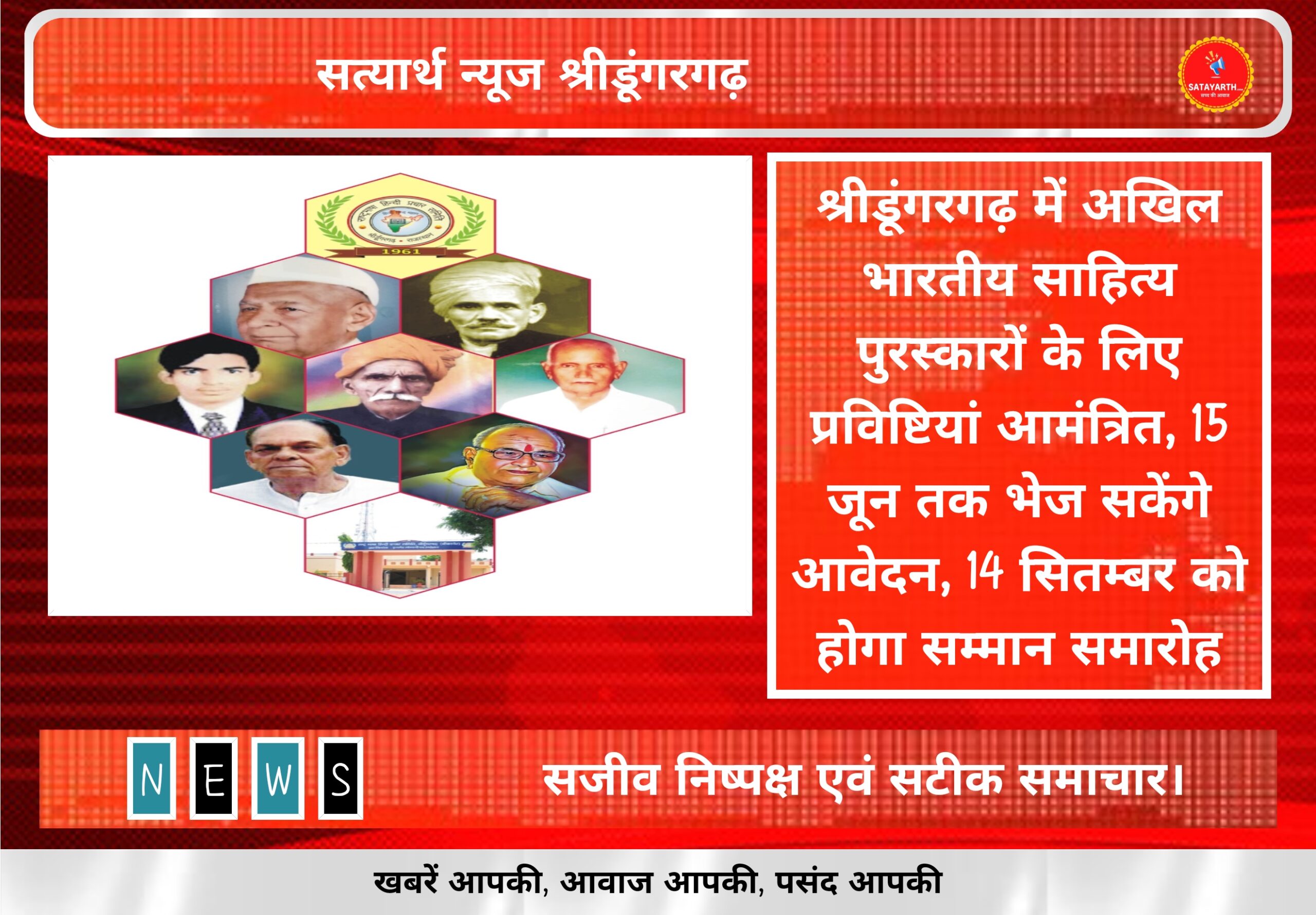 सत्यार्थ न्यूज श्रीडूंगरगढ़-सवांददाता ब्युरो चीफ साहित्य के मौलिक लेखन को सम्मान प्रदान करने के दृष्टिगत राष्ट्रभाषा हिन्दी प्रचार समिति,श्रीडूंगरगढ द्वारा…