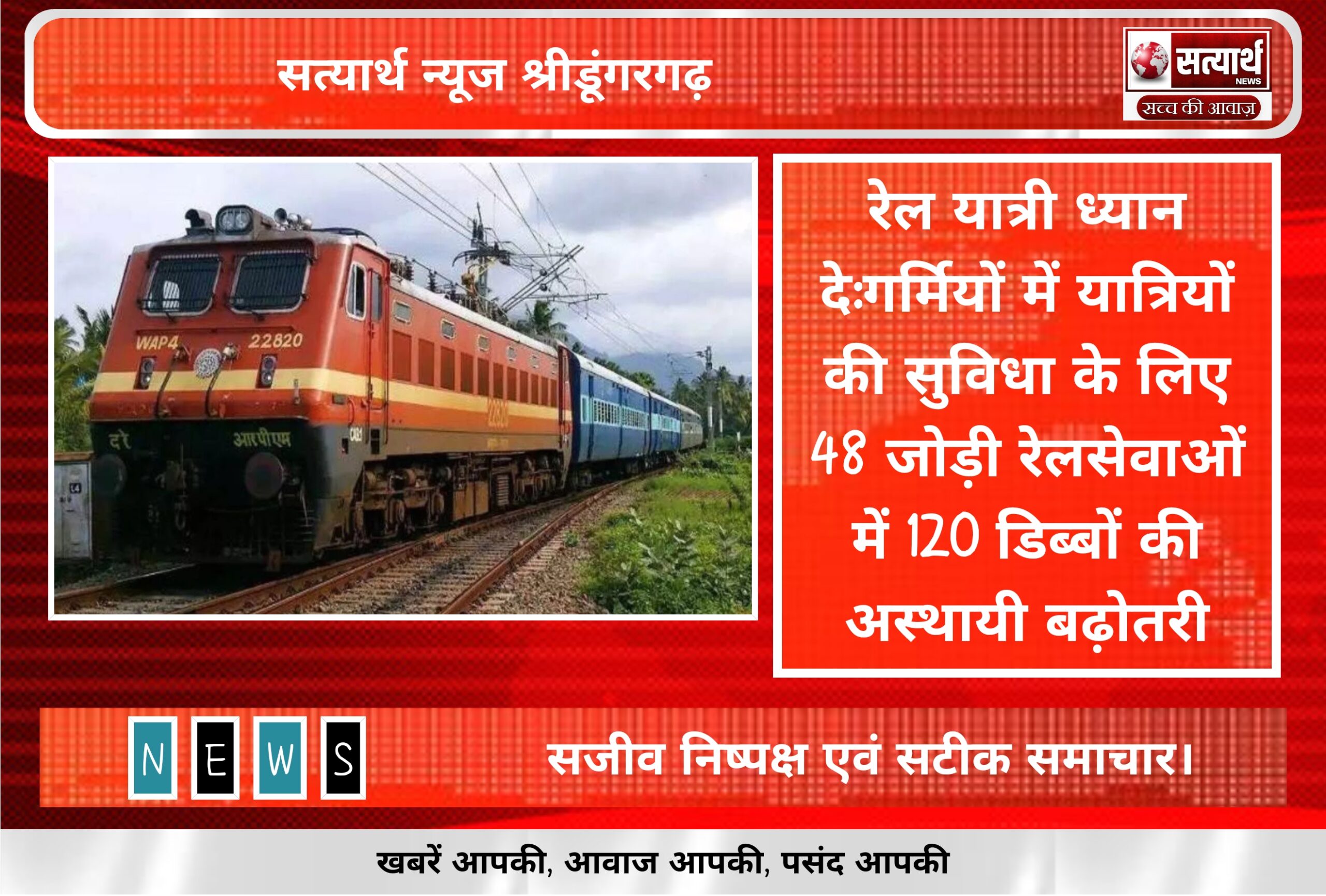 सत्यार्थ न्यूज श्रीडूंगरगढ़-सवांददाता मीडिया प्रभारी गर्मी की छुट्टियों में रेलों में यात्री भार बढ़ने के कारण रेलवे ने पहले से…