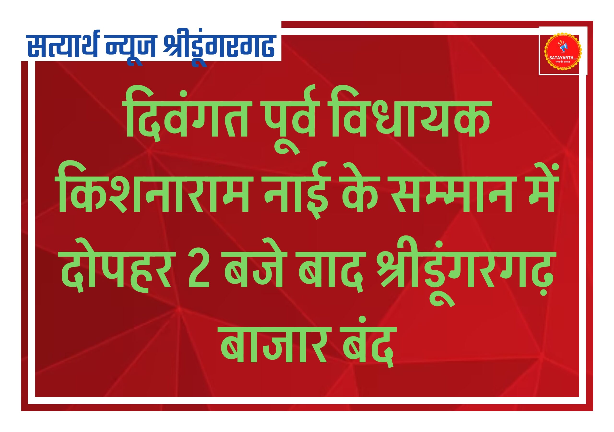 सत्यार्थ न्यूज श्रीडूंगरगढ़-सवांददाता ब्यूरो चीफ पूर्व विधायक किशनाराम नाई के निधन पर शोक स्वरूप मंगलवार को श्रीडूंगरगढ़ व्यापार मंडल ने…