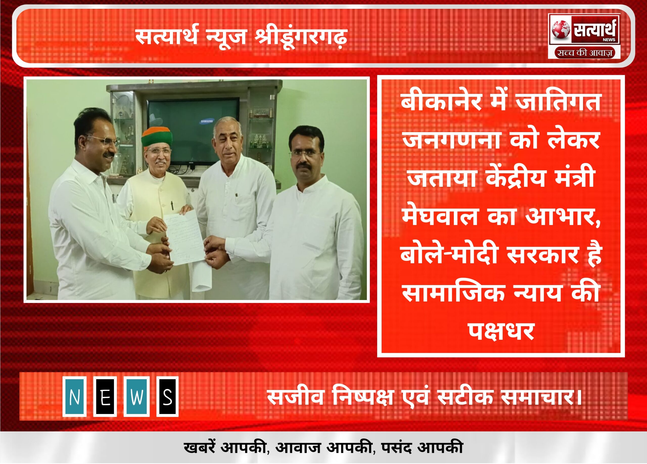सत्यार्थ न्यूज श्रीडूंगरगढ़-सवांददाता ब्युरो चीफ बीकानेर सांसद सेवा केंद्र में आज केंद्र सरकार द्वारा जातिगत जनगणना कराए जाने के निर्णय…