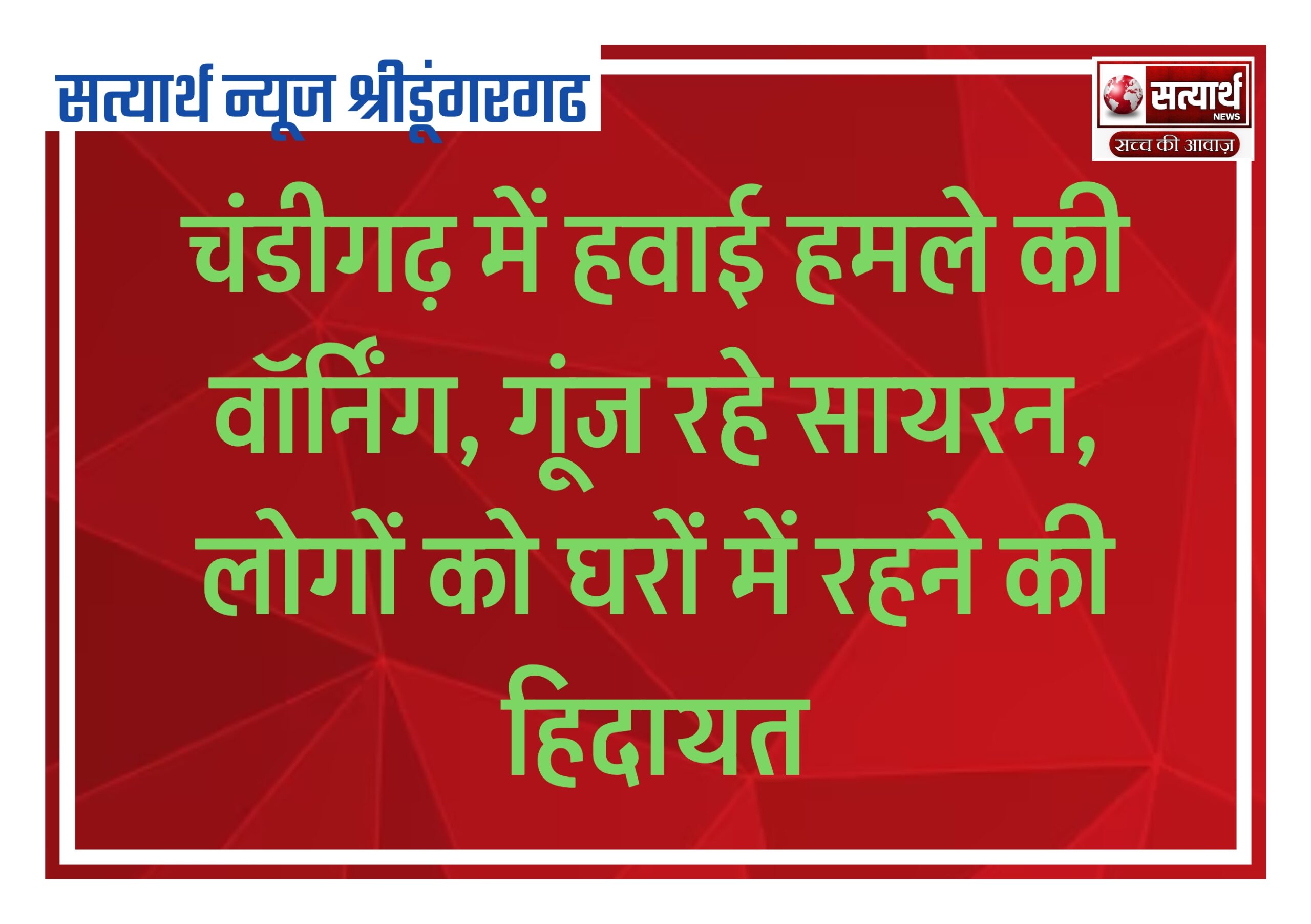 सत्यार्थ न्यूज श्रीडूंगरगढ़- सवांददाता ब्यूरो चीफ चंडीगढ़ में शुक्रवार को हवाई हमले की चेतावनी दी गई है। वॉर्निंग एयरफोर्स स्टेशन…