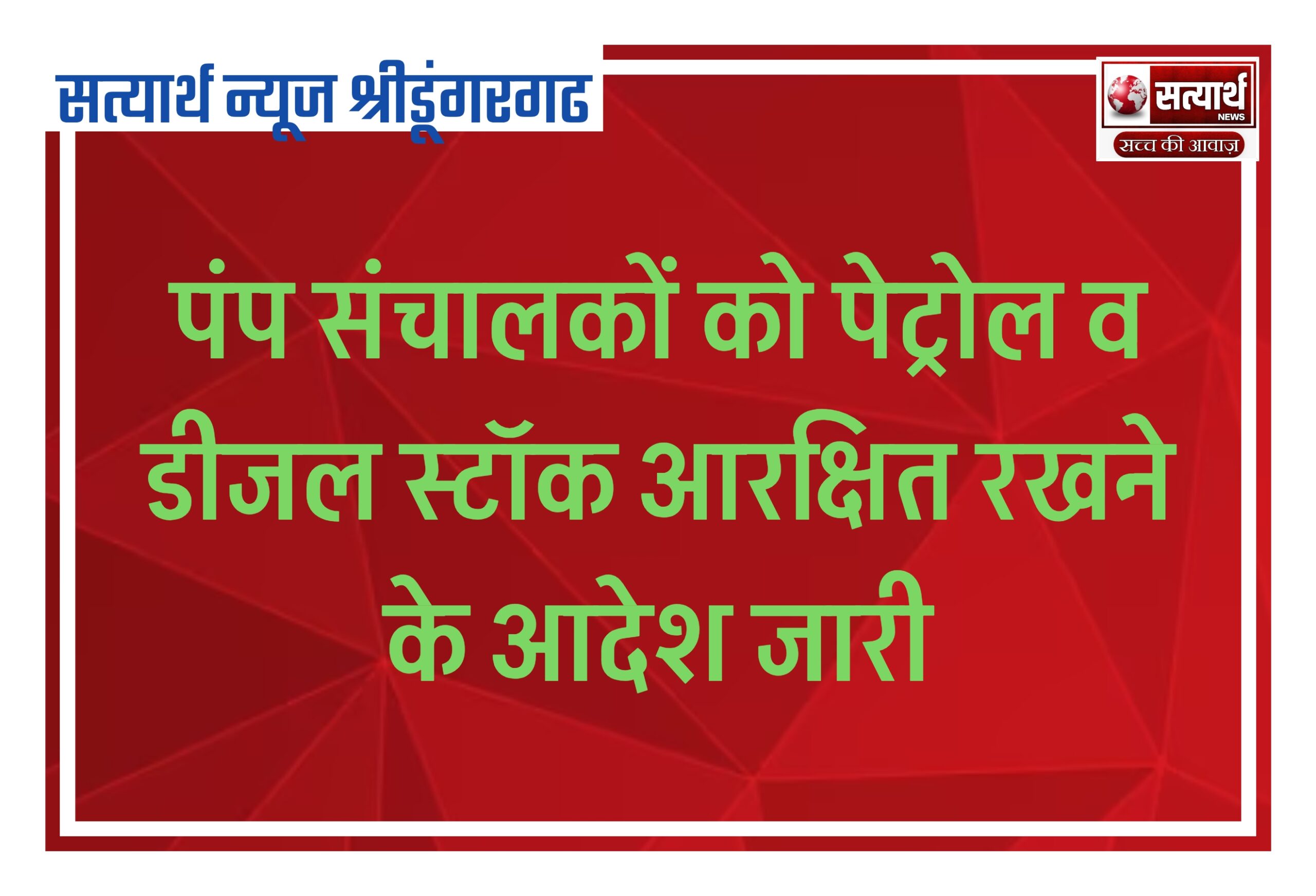 सत्यार्थ न्यूज श्रीडूंगरगढ- सवांददाता ब्युरो चीफ वर्तमान परिस्थितियों के मद्देनजर रखते हुए पेट्रोल पंपों पर पेट्रोल व डीजल का स्टॉक…