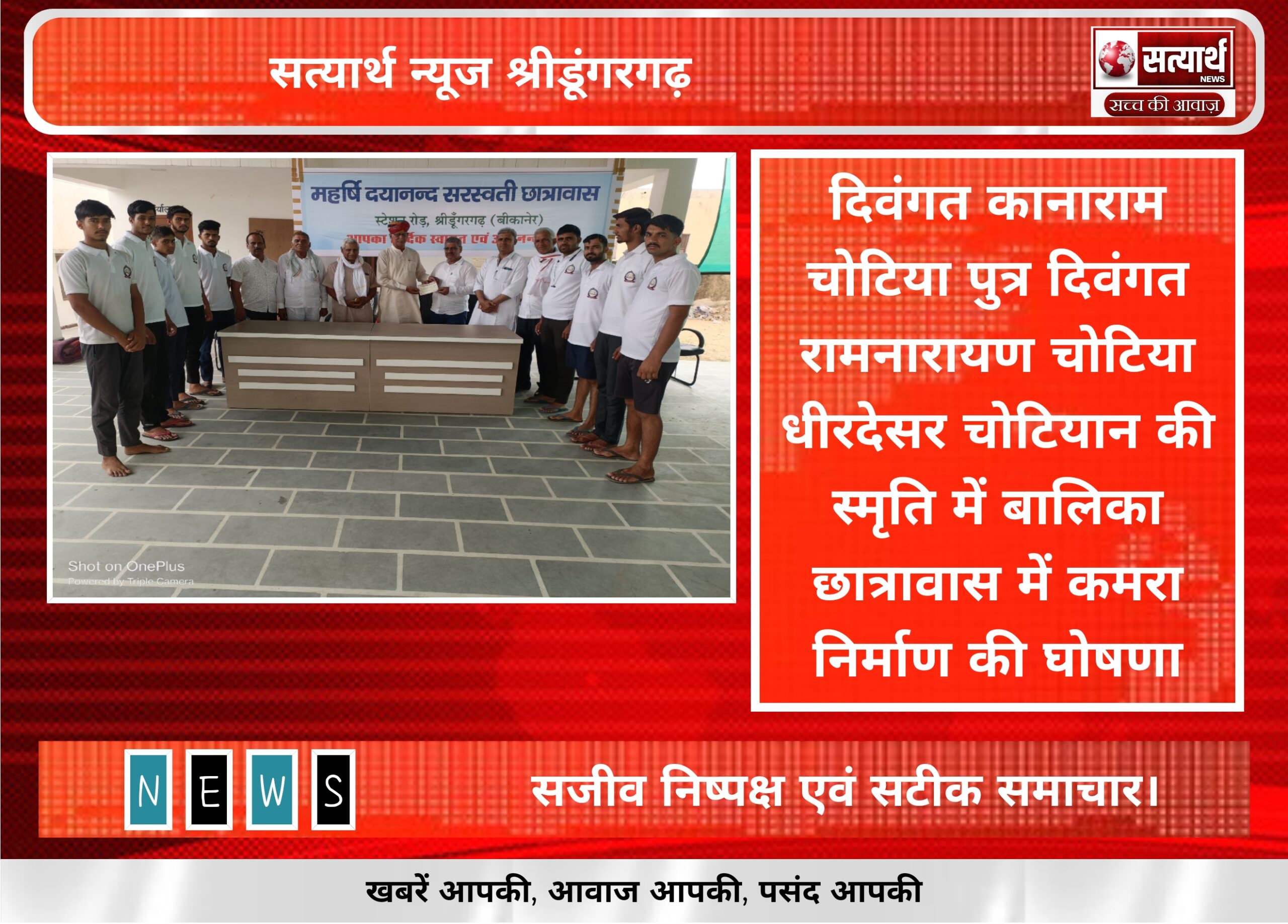 सत्यार्थ न्यूज श्रीडूंगरगढ़ -सवांददाता ब्यूरो चीफ श्रीडूंगरगढ़ बालिका छात्रावास श्रीडूंगरगढ़ में दिवंगत कानाराम चोटिया पुत्र दिवंगत रामनारायण चोटिया धीरदेसर चोटियान…